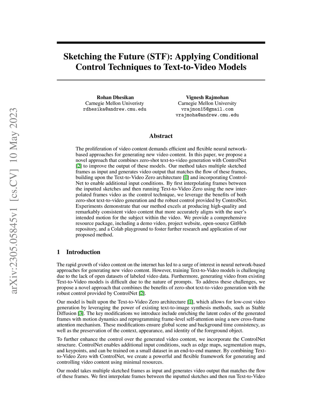 The proliferation of video content demands efficient and flexible neural network based approaches for generating new video content. In this paper, we propose a novel approach that combines zero-shot text-to-video generation with ControlNet to improve the output of these models. Our method takes multiple sketched frames as input and generates video output that matches the flow of these frames, building upon the Text-to-Video Zero architecture and incorporating ControlNet to enable additional input conditions. By first interpolating frames between the inputted sketches and then running Text-to-Video Zero using the new interpolated frames video as the control technique, we leverage the benefits of both zero-shot text-to-video generation and the robust control provided by ControlNet. Experiments demonstrate that our method excels at producing high-quality and remarkably consistent video content that more accurately aligns with the user's intended motion for the subject within the video. We provide a comprehensive resource package, including a demo video, project website, open-source GitHub repository, and a Colab playground to foster further research and application of our proposed method.