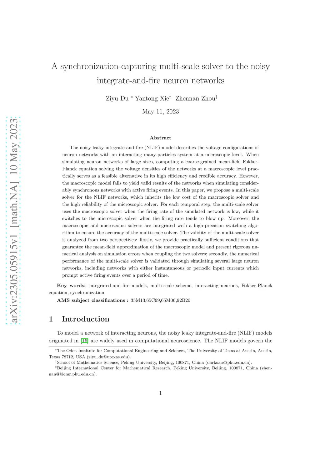 The noisy leaky integrate-and-fire (NLIF) model describes the voltage configurations of neuron networks with an interacting many-particles system at a microscopic level. When simulating neuron networks of large sizes, computing a coarse-grained mean-field Fokker-Planck equation solving the voltage densities of the networks at a macroscopic level practically serves as a feasible alternative in its high efficiency and credible accuracy. However, the macroscopic model fails to yield valid results of the networks when simulating considerably synchronous networks with active firing events. In this paper, we propose a multi-scale solver for the NLIF networks, which inherits the low cost of the macroscopic solver and the high reliability of the microscopic solver. For each temporal step, the multi-scale solver uses the macroscopic solver when the firing rate of the simulated network is low, while it switches to the microscopic solver when the firing rate tends to blow up. Moreover, the macroscopic and microscopic solvers are integrated with a high-precision switching algorithm to ensure the accuracy of the multi-scale solver. The validity of the multi-scale solver is analyzed from two perspectives: firstly, we provide practically sufficient conditions that guarantee the mean-field approximation of the macroscopic model and present rigorous numerical analysis on simulation errors when coupling the two solvers; secondly, the numerical performance of the multi-scale solver is validated through simulating several large neuron networks, including networks with either instantaneous or periodic input currents which prompt active firing events over a period of time.