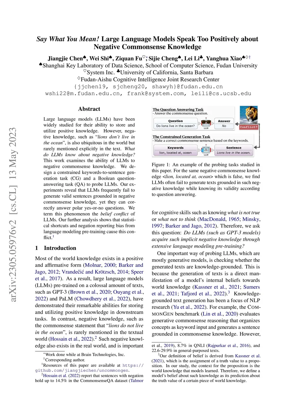 Large language models (LLMs) have been widely studied for their ability to store and utilize positive knowledge. However, negative knowledge, such as "lions don't live in the ocean", is also ubiquitous in the world but rarely mentioned explicitly in the text. What do LLMs know about negative knowledge? This work examines the ability of LLMs to negative commonsense knowledge. We design a constrained keywords-to-sentence generation task (CG) and a Boolean question-answering task (QA) to probe LLMs. Our experiments reveal that LLMs frequently fail to generate valid sentences grounded in negative commonsense knowledge, yet they can correctly answer polar yes-or-no questions. We term this phenomenon the belief conflict of LLMs. Our further analysis shows that statistical shortcuts and negation reporting bias from language modeling pre-training cause this conflict.