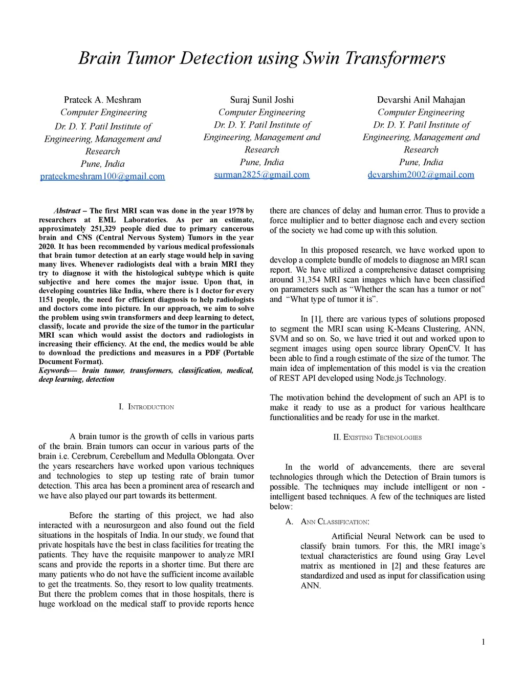 The first MRI scan was done in the year 1978 by researchers at EML Laboratories. As per an estimate, approximately 251,329 people died due to primary cancerous brain and CNS (Central Nervous System) Tumors in the year 2020. It has been recommended by various medical professionals that brain tumor detection at an early stage would help in saving many lives. Whenever radiologists deal with a brain MRI they try to diagnose it with the histological subtype which is quite subjective and here comes the major issue. Upon that, in developing countries like India, where there is 1 doctor for every 1151 people, the need for efficient diagnosis to help radiologists and doctors come into picture. In our approach, we aim to solve the problem using swin transformers and deep learning to detect, classify, locate and provide the size of the tumor in the particular MRI scan which would assist the doctors and radiologists in increasing their efficiency. At the end, the medics would be able to download the predictions and measures in a PDF (Portable Document Format). Keywords: brain tumor, transformers, classification, medical, deep learning, detection