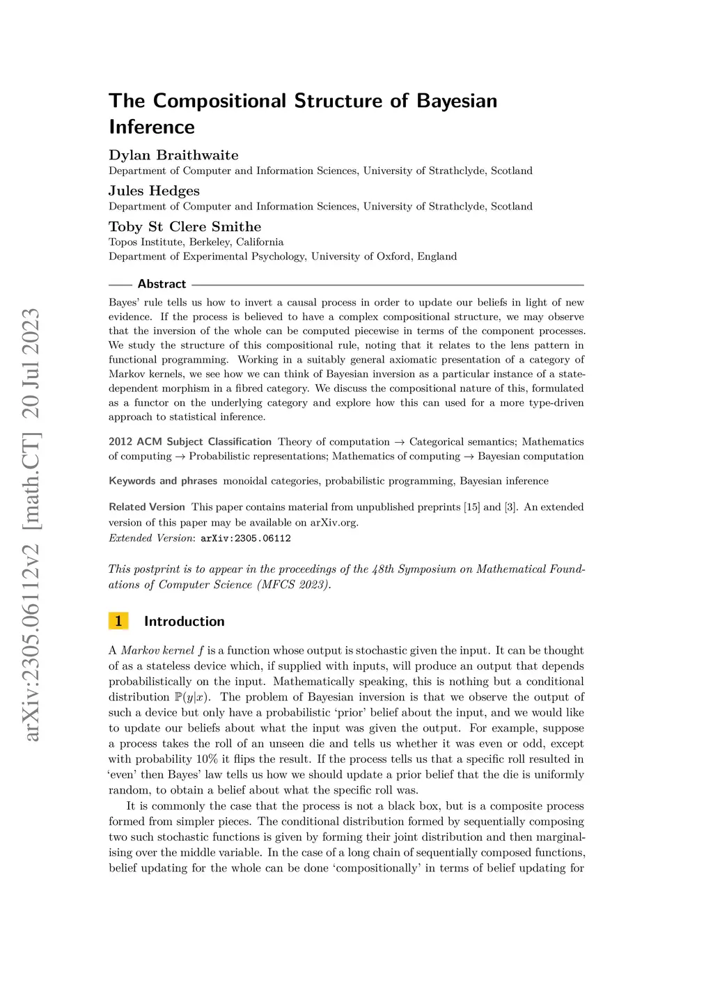 Bayes' rule tells us how to invert a causal process in order to update our beliefs in light of new evidence. If the process is believed to have a complex compositional structure, we may observe that the inversion of the whole can be computed piecewise in terms of the component processes. We study the structure of this compositional rule, noting that it relates to the lens pattern in functional programming. Working in a suitably general axiomatic presentation of a category of Markov kernels, we see how we can think of Bayesian inversion as a particular instance of a state-dependent morphism in a fibred category. We discuss the compositional nature of this, formulated as a functor on the underlying category and explore how this can used for a more type-driven approach to statistical inference.