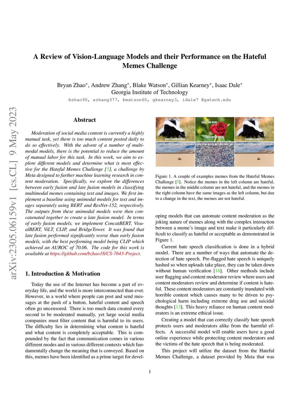Moderation of social media content is currently a highly manual task, yet there is too much content posted daily to do so effectively. With the advent of a number of multimodal models, there is the potential to reduce the amount of manual labor for this task. In this work, we aim to explore different models and determine what is most effective for the Hateful Memes Challenge, a challenge by Meta designed to further machine learning research in content moderation. Specifically, we explore the differences between early fusion and late fusion models in classifying multimodal memes containing text and images. We first implement a baseline using unimodal models for text and images separately using BERT and ResNet-152, respectively. The outputs from these unimodal models were then concatenated together to create a late fusion model. In terms of early fusion models, we implement ConcatBERT, VisualBERT, ViLT, CLIP, and BridgeTower. It was found that late fusion performed significantly worse than early fusion models, with the best performing model being CLIP which achieved an AUROC of 70.06. The code for this work is available at https://github.com/bzhao18/CS-7643-Project.