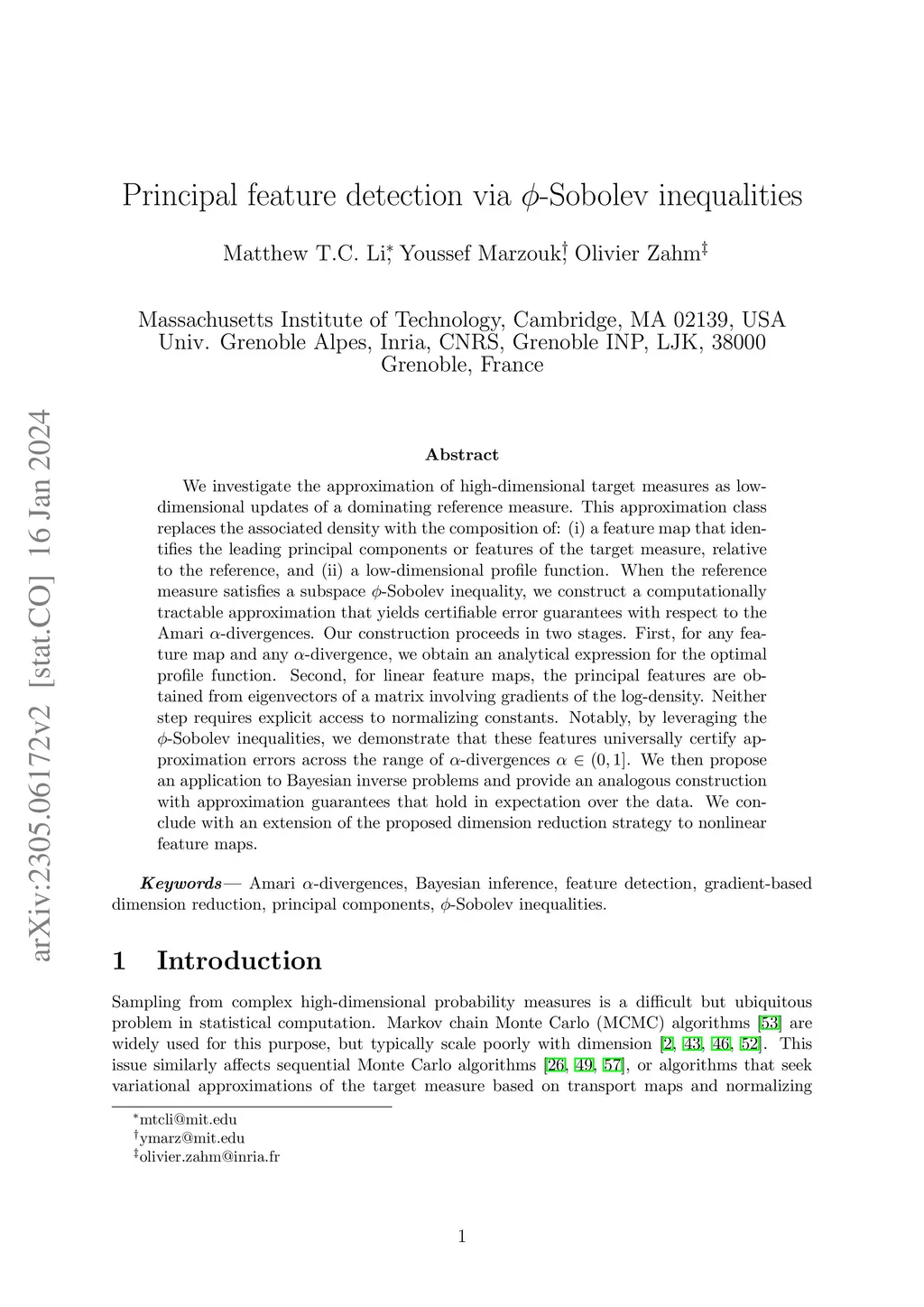 We investigate the approximation of high-dimensional target measures as low-dimensional updates of a dominating reference measure. This approximation class replaces the associated density with the composition of: (i) a feature map that identifies the leading principal components or features of the target measure, relative to the reference, and (ii) a low-dimensional profile function. When the reference measure satisfies a subspace -Sobolev inequality, we construct a computationally tractable approximation that yields certifiable error guarantees with respect to the Amari -divergences. Our construction proceeds in two stages. First, for any feature map and any -divergence, we obtain an analytical expression for the optimal profile function. Second, for linear feature maps, the principal features are obtained from eigenvectors of a matrix involving gradients of the log-density. Neither step requires explicit access to normalizing constants. Notably, by leveraging the -Sobolev inequalities, we demonstrate that these features universally certify approximation errors across the range of -divergences . We then propose an application to Bayesian inverse problems and provide an analogous construction with approximation guarantees that hold in expectation over the data. We conclude with an extension of the proposed dimension reduction strategy to nonlinear feature maps.