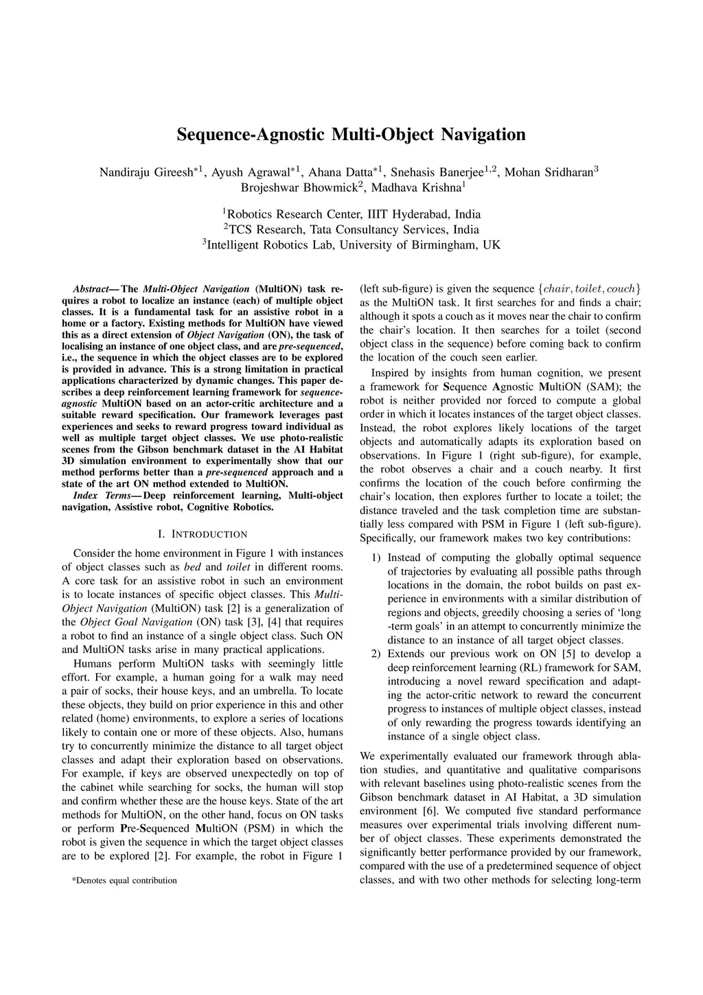 The Multi-Object Navigation (MultiON) task requires a robot to localize an instance (each) of multiple object classes. It is a fundamental task for an assistive robot in a home or a factory. Existing methods for MultiON have viewed this as a direct extension of Object Navigation (ON), the task of localising an instance of one object class, and are pre-sequenced, i.e., the sequence in which the object classes are to be explored is provided in advance. This is a strong limitation in practical applications characterized by dynamic changes. This paper describes a deep reinforcement learning framework for sequence-agnostic MultiON based on an actor-critic architecture and a suitable reward specification. Our framework leverages past experiences and seeks to reward progress toward individual as well as multiple target object classes. We use photo-realistic scenes from the Gibson benchmark dataset in the AI Habitat 3D simulation environment to experimentally show that our method performs better than a pre-sequenced approach and a state of the art ON method extended to MultiON.