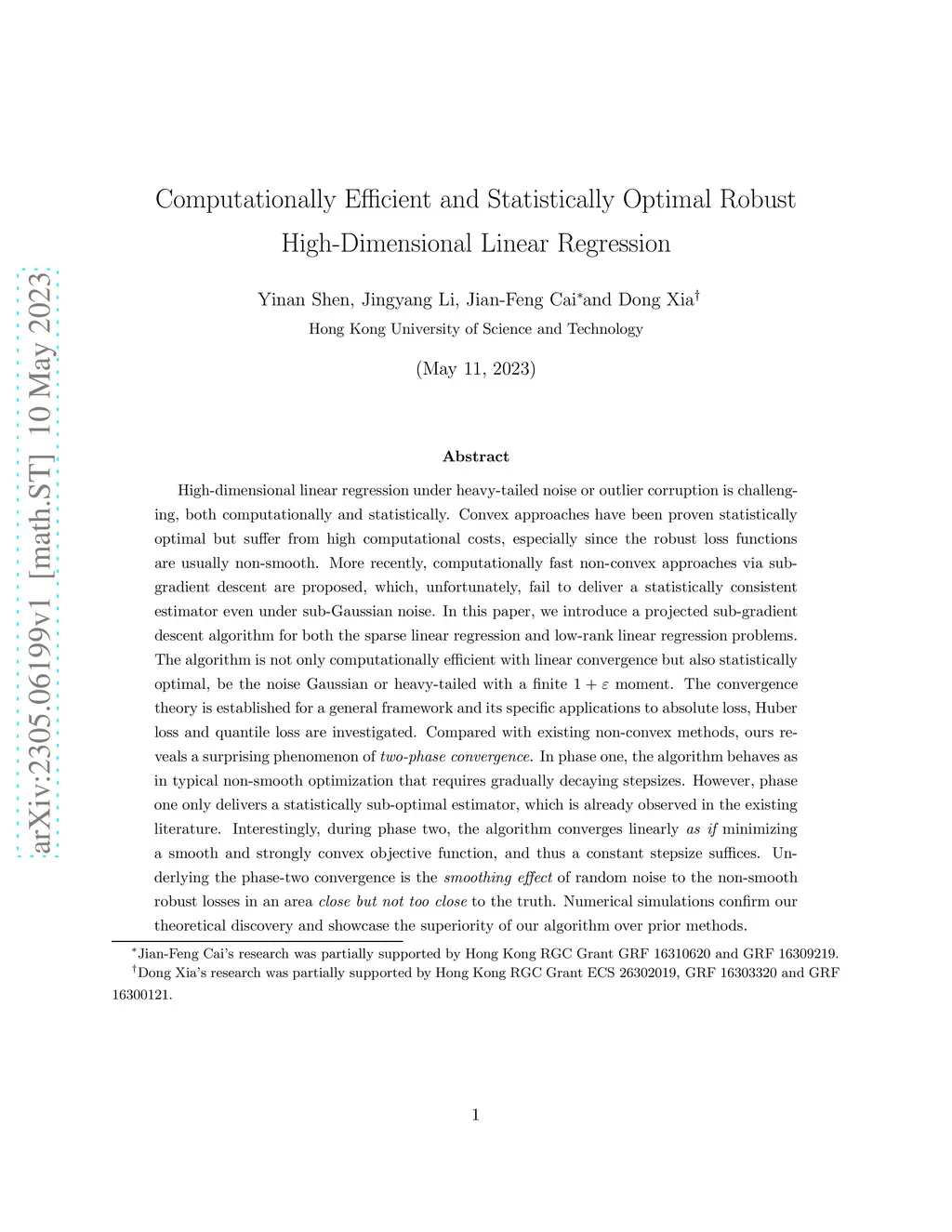 High-dimensional linear regression under heavy-tailed noise or outlier corruption is challenging, both computationally and statistically. Convex approaches have been proven statistically optimal but suffer from high computational costs, especially since the robust loss functions are usually non-smooth. More recently, computationally fast non-convex approaches via sub-gradient descent are proposed, which, unfortunately, fail to deliver a statistically consistent estimator even under sub-Gaussian noise. In this paper, we introduce a projected sub-gradient descent algorithm for both the sparse linear regression and low-rank linear regression problems. The algorithm is not only computationally efficient with linear convergence but also statistically optimal, be the noise Gaussian or heavy-tailed with a finite 1 + epsilon moment. The convergence theory is established for a general framework and its specific applications to absolute loss, Huber loss and quantile loss are investigated. Compared with existing non-convex methods, ours reveals a surprising phenomenon of two-phase convergence. In phase one, the algorithm behaves as in typical non-smooth optimization that requires gradually decaying stepsizes. However, phase one only delivers a statistically sub-optimal estimator, which is already observed in the existing literature. Interestingly, during phase two, the algorithm converges linearly as if minimizing a smooth and strongly convex objective function, and thus a constant stepsize suffices. Underlying the phase-two convergence is the smoothing effect of random noise to the non-smooth robust losses in an area close but not too close to the truth. Numerical simulations confirm our theoretical discovery and showcase the superiority of our algorithm over prior methods.