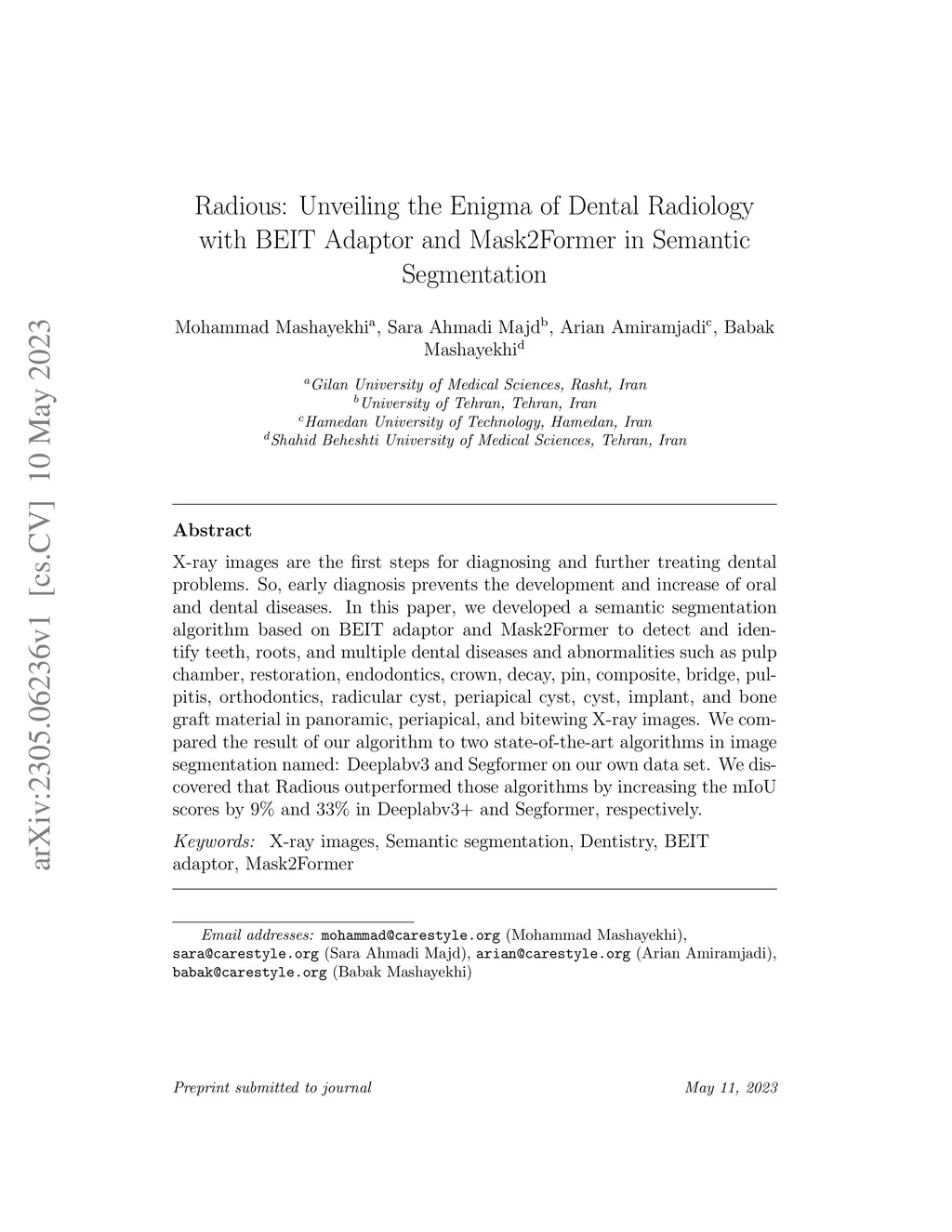 X-ray images are the first steps for diagnosing and further treating dental problems. So, early diagnosis prevents the development and increase of oral and dental diseases. In this paper, we developed a semantic segmentation algorithm based on BEIT adaptor and Mask2Former to detect and identify teeth, roots, and multiple dental diseases and abnormalities such as pulp chamber, restoration, endodontics, crown, decay, pin, composite, bridge, pulpitis, orthodontics, radicular cyst, periapical cyst, cyst, implant, and bone graft material in panoramic, periapical, and bitewing X-ray images. We compared the result of our algorithm to two state-of-the-art algorithms in image segmentation named: Deeplabv3 and Segformer on our own data set. We discovered that Radious outperformed those algorithms by increasing the mIoU scores by 9% and 33% in Deeplabv3+ and Segformer, respectively.