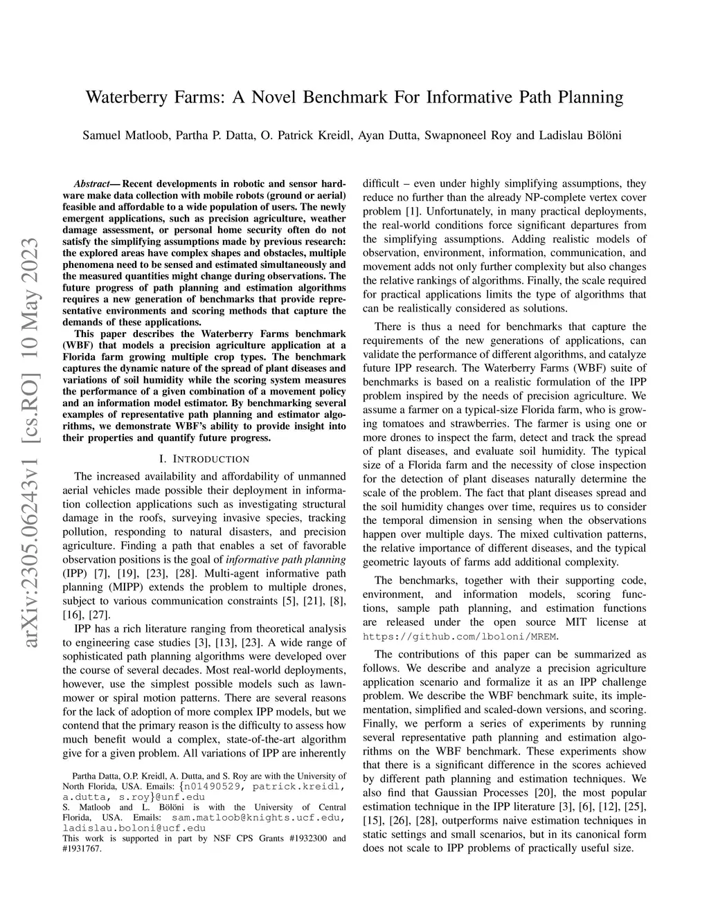 Recent developments in robotic and sensor hardware make data collection with mobile robots (ground or aerial) feasible and affordable to a wide population of users. The newly emergent applications, such as precision agriculture, weather damage assessment, or personal home security often do not satisfy the simplifying assumptions made by previous research: the explored areas have complex shapes and obstacles, multiple phenomena need to be sensed and estimated simultaneously and the measured quantities might change during observations. The future progress of path planning and estimation algorithms requires a new generation of benchmarks that provide representative environments and scoring methods that capture the demands of these applications. This paper describes the Waterberry Farms benchmark (WBF) that models a precision agriculture application at a Florida farm growing multiple crop types. The benchmark captures the dynamic nature of the spread of plant diseases and variations of soil humidity while the scoring system measures the performance of a given combination of a movement policy and an information model estimator. By benchmarking several examples of representative path planning and estimator algorithms, we demonstrate WBF's ability to provide insight into their properties and quantify future progress.