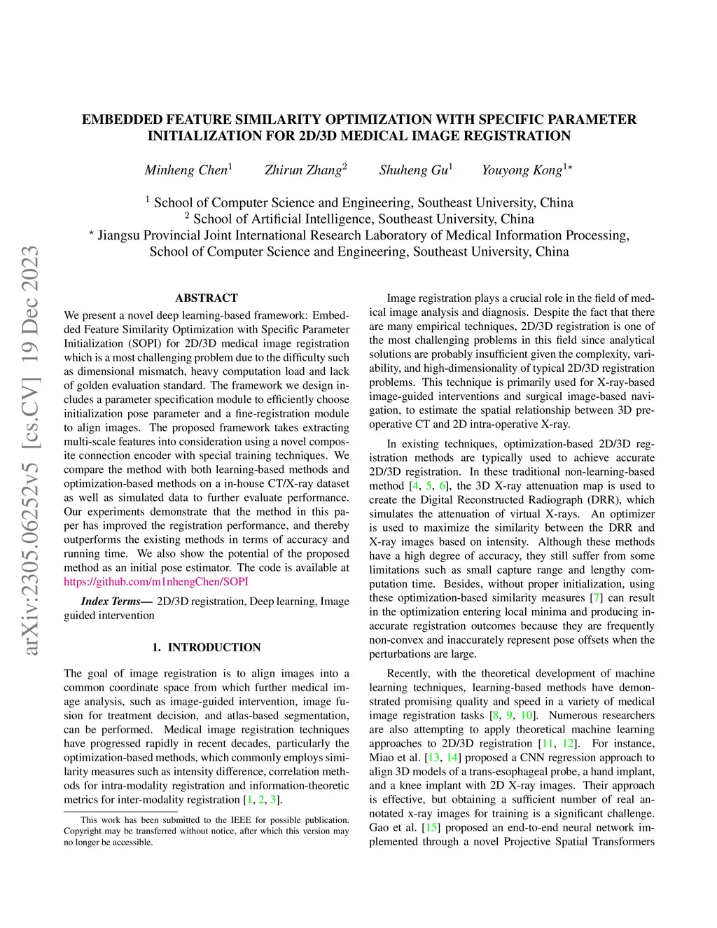 We present a novel deep learning-based framework: Embedded Feature Similarity Optimization with Specific Parameter Initialization (SOPI) for 2D/3D medical image registration which is a most challenging problem due to the difficulty such as dimensional mismatch, heavy computation load and lack of golden evaluation standard. The framework we design includes a parameter specification module to efficiently choose initialization pose parameter and a fine-registration module to align images. The proposed framework takes extracting multi-scale features into consideration using a novel composite connection encoder with special training techniques. We compare the method with both learning-based methods and optimization-based methods on a in-house CT/X-ray dataset as well as simulated data to further evaluate performance. Our experiments demonstrate that the method in this paper has improved the registration performance, and thereby outperforms the existing methods in terms of accuracy and running time. We also show the potential of the proposed method as an initial pose estimator. The code is available at https://github.com/m1nhengChen/SOPI