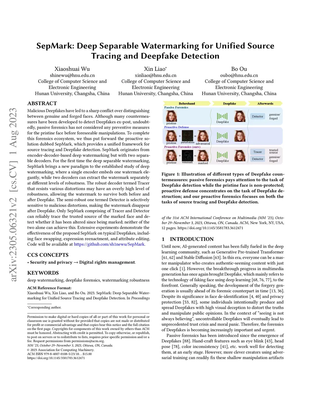 Malicious Deepfakes have led to a sharp conflict over distinguishing between genuine and forged faces. Although many countermeasures have been developed to detect Deepfakes ex-post, undoubtedly, passive forensics has not considered any preventive measures for the pristine face before foreseeable manipulations. To complete this forensics ecosystem, we thus put forward the proactive solution dubbed SepMark, which provides a unified framework for source tracing and Deepfake detection. SepMark originates from encoder-decoder-based deep watermarking but with two separable decoders. For the first time the deep separable watermarking, SepMark brings a new paradigm to the established study of deep watermarking, where a single encoder embeds one watermark elegantly, while two decoders can extract the watermark separately at different levels of robustness. The robust decoder termed Tracer that resists various distortions may have an overly high level of robustness, allowing the watermark to survive both before and after Deepfake. The semi-robust one termed Detector is selectively sensitive to malicious distortions, making the watermark disappear after Deepfake. Only SepMark comprising of Tracer and Detector can reliably trace the trusted source of the marked face and detect whether it has been altered since being marked; neither of the two alone can achieve this. Extensive experiments demonstrate the effectiveness of the proposed SepMark on typical Deepfakes, including face swapping, expression reenactment, and attribute editing.