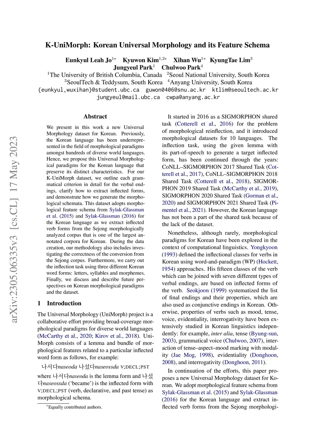 We present in this work a new Universal Morphology dataset for Korean. Previously, the Korean language has been underrepresented in the field of morphological paradigms amongst hundreds of diverse world languages. Hence, we propose this Universal Morphological paradigms for the Korean language that preserve its distinct characteristics. For our K-UniMorph dataset, we outline each grammatical criterion in detail for the verbal endings, clarify how to extract inflected forms, and demonstrate how we generate the morphological schemata. This dataset adopts morphological feature schema from Sylak-Glassman et al. (2015) and Sylak-Glassman (2016) for the Korean language as we extract inflected verb forms from the Sejong morphologically analyzed corpus that is one of the largest annotated corpora for Korean. During the data creation, our methodology also includes investigating the correctness of the conversion from the Sejong corpus. Furthermore, we carry out the inflection task using three different Korean word forms: letters, syllables and morphemes. Finally, we discuss and describe future perspectives on Korean morphological paradigms and the dataset.