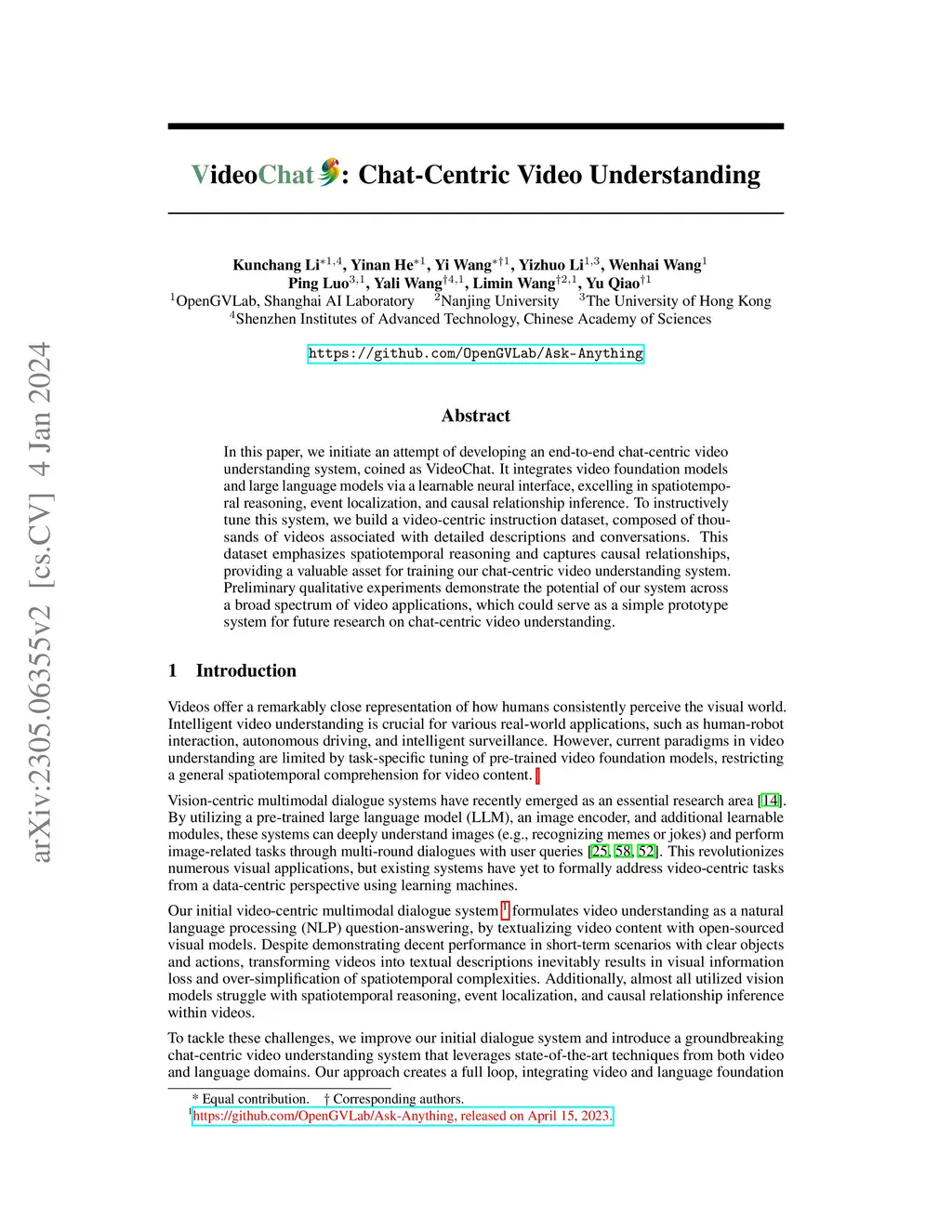 In this study, we initiate an exploration into video understanding by introducing VideoChat, an end-to-end chat-centric video understanding system. It integrates video foundation models and large language models via a learnable neural interface, excelling in spatiotemporal reasoning, event localization, and causal relationship inference. To instructively tune this system, we propose a video-centric instruction dataset, composed of thousands of videos matched with detailed descriptions and conversations. This dataset emphasizes spatiotemporal reasoning and causal relationships, providing a valuable asset for training chat-centric video understanding systems. Preliminary qualitative experiments reveal our system's potential across a broad spectrum of video applications and set the standard for future research. Access our code and data at https://github.com/OpenGVLab/Ask-Anything