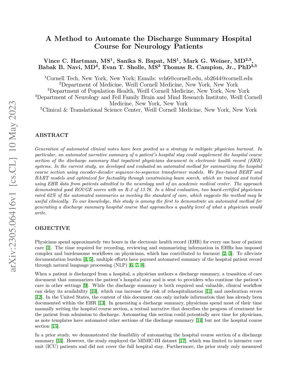 Generation of automated clinical notes have been posited as a strategy to mitigate physician burnout. In particular, an automated narrative summary of a patient's hospital stay could supplement the hospital course section of the discharge summary that inpatient physicians document in electronic health record (EHR) systems. In the current study, we developed and evaluated an automated method for summarizing the hospital course section using encoder-decoder sequence-to-sequence transformer models. We fine tuned BERT and BART models and optimized for factuality through constraining beam search, which we trained and tested using EHR data from patients admitted to the neurology unit of an academic medical center. The approach demonstrated good ROUGE scores with an R-2 of 13.76. In a blind evaluation, two board-certified physicians rated 62% of the automated summaries as meeting the standard of care, which suggests the method may be useful clinically. To our knowledge, this study is among the first to demonstrate an automated method for generating a discharge summary hospital course that approaches a quality level of what a physician would write.