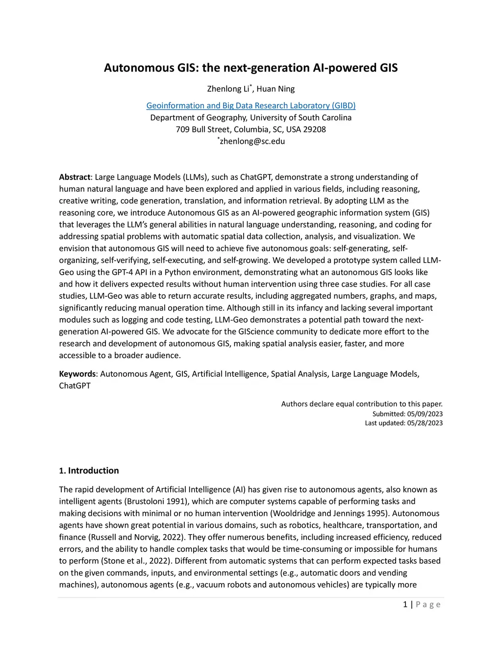 Large Language Models (LLMs), such as ChatGPT, demonstrate a strong understanding of human natural language and have been explored and applied in various fields, including reasoning, creative writing, code generation, translation, and information retrieval. By adopting LLM as the reasoning core, we introduce Autonomous GIS as an AI-powered geographic information system (GIS) that leverages the LLM's general abilities in natural language understanding, reasoning, and coding for addressing spatial problems with automatic spatial data collection, analysis, and visualization. We envision that autonomous GIS will need to achieve five autonomous goals: self-generating, self-organizing, self-verifying, self-executing, and self-growing. We developed a prototype system called LLM-Geo using the GPT-4 API in a Python environment, demonstrating what an autonomous GIS looks like and how it delivers expected results without human intervention using three case studies. For all case studies, LLM-Geo was able to return accurate results, including aggregated numbers, graphs, and maps, significantly reducing manual operation time. Although still in its infancy and lacking several important modules such as logging and code testing, LLM-Geo demonstrates a potential path toward the next-generation AI-powered GIS. We advocate for the GIScience community to dedicate more effort to the research and development of autonomous GIS, making spatial analysis easier, faster, and more accessible to a broader audience.