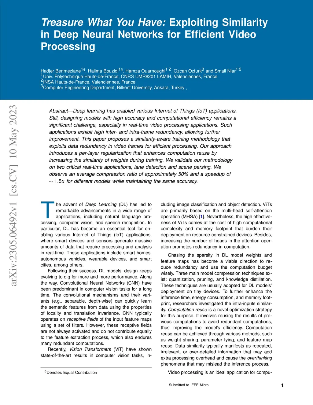 Deep learning has enabled various Internet of Things (IoT) applications. Still, designing models with high accuracy and computational efficiency remains a significant challenge, especially in real-time video processing applications. Such applications exhibit high inter- and intra-frame redundancy, allowing further improvement. This paper proposes a similarity-aware training methodology that exploits data redundancy in video frames for efficient processing. Our approach introduces a per-layer regularization that enhances computation reuse by increasing the similarity of weights during training. We validate our methodology on two critical real-time applications, lane detection and scene parsing. We observe an average compression ratio of approximately 50% and a speedup of \sim 1.5x for different models while maintaining the same accuracy.