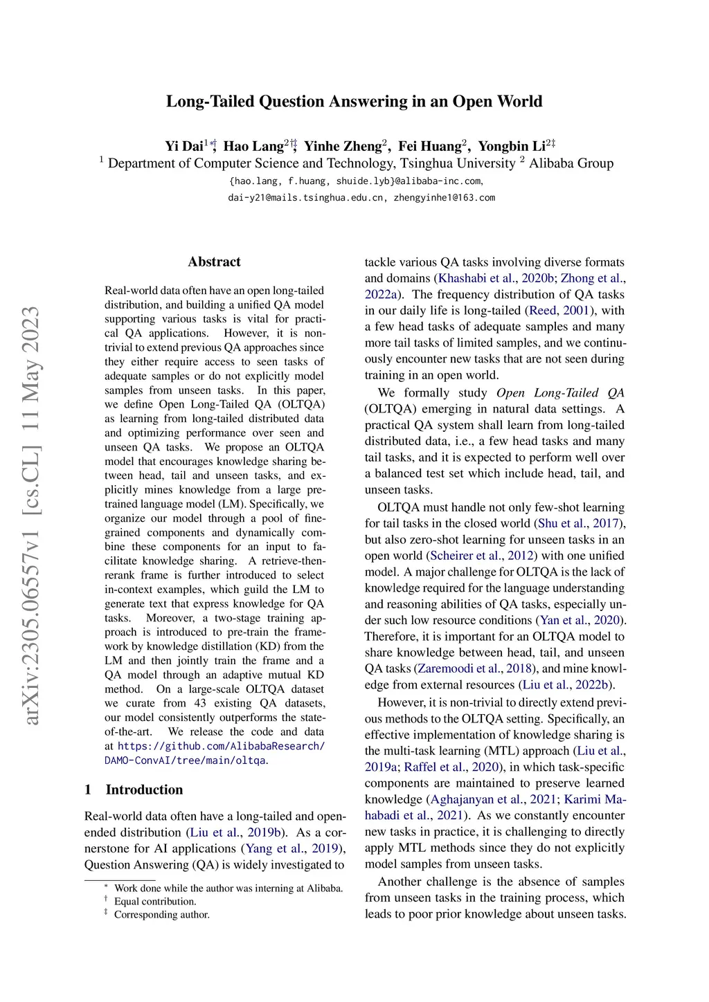 Real-world data often have an open long-tailed distribution, and building a unified QA model supporting various tasks is vital for practical QA applications. However, it is non-trivial to extend previous QA approaches since they either require access to seen tasks of adequate samples or do not explicitly model samples from unseen tasks. In this paper, we define Open Long-Tailed QA (OLTQA) as learning from long-tailed distributed data and optimizing performance over seen and unseen QA tasks. We propose an OLTQA model that encourages knowledge sharing between head, tail and unseen tasks, and explicitly mines knowledge from a large pre-trained language model (LM). Specifically, we organize our model through a pool of fine-grained components and dynamically combine these components for an input to facilitate knowledge sharing. A retrieve-then-rerank frame is further introduced to select in-context examples, which guild the LM to generate text that express knowledge for QA tasks. Moreover, a two-stage training approach is introduced to pre-train the framework by knowledge distillation (KD) from the LM and then jointly train the frame and a QA model through an adaptive mutual KD method. On a large-scale OLTQA dataset we curate from 43 existing QA datasets, our model consistently outperforms the state-of-the-art. We release the code and data at \url{https://github.com/AlibabaResearch/DAMO-ConvAI/tree/main/oltqa}.