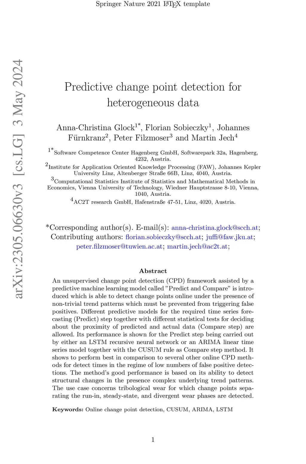 A change point detection (CPD) framework assisted by a predictive machine learning model called "Predict and Compare" is introduced and characterised in relation to other state-of-the-art online CPD routines which it outperforms in terms of false positive rate and out-of-control average run length. The method's focus is on improving standard methods from sequential analysis such as the CUSUM rule in terms of these quality measures. This is achieved by replacing typically used trend estimation functionals such as the running mean with more sophisticated predictive models (Predict step), and comparing their prognosis with actual data (Compare step). The two models used in the Predict step are the ARIMA model and the LSTM recursive neural network. However, the framework is formulated in general terms, so as to allow the use of other prediction or comparison methods than those tested here. The power of the method is demonstrated in a tribological case study in which change points separating the run-in, steady-state, and divergent wear phases are detected in the regime of very few false positives.