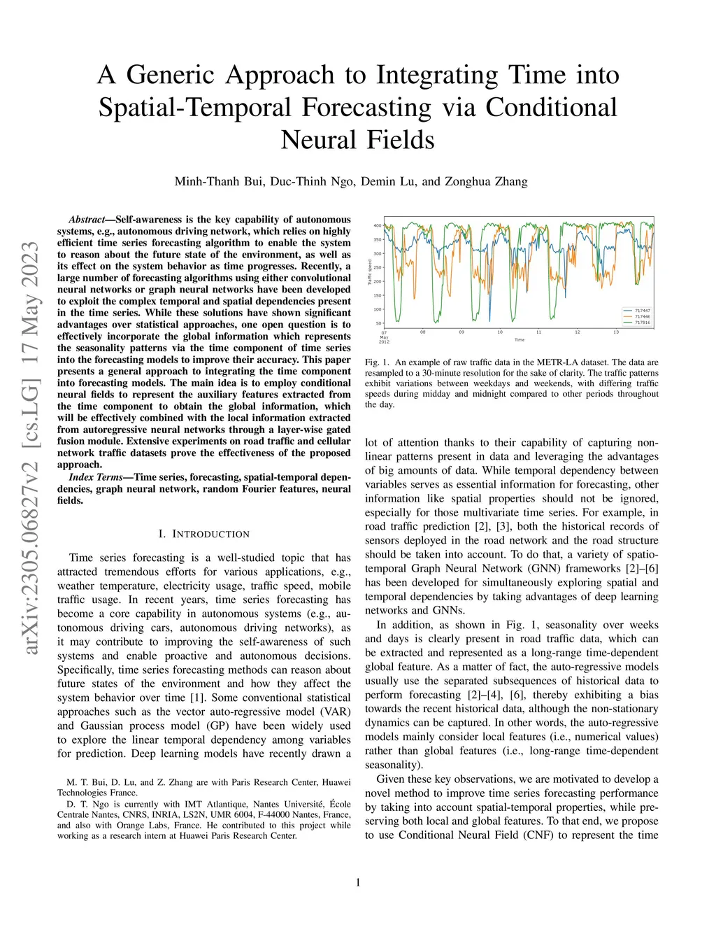 Self-awareness is the key capability of autonomous systems, e.g., autonomous driving network, which relies on highly efficient time series forecasting algorithm to enable the system to reason about the future state of the environment, as well as its effect on the system behavior as time progresses. Recently, a large number of forecasting algorithms using either convolutional neural networks or graph neural networks have been developed to exploit the complex temporal and spatial dependencies present in the time series. While these solutions have shown significant advantages over statistical approaches, one open question is to effectively incorporate the global information which represents the seasonality patterns via the time component of time series into the forecasting models to improve their accuracy. This paper presents a general approach to integrating the time component into forecasting models. The main idea is to employ conditional neural fields to represent the auxiliary features extracted from the time component to obtain the global information, which will be effectively combined with the local information extracted from autoregressive neural networks through a layer-wise gated fusion module. Extensive experiments on road traffic and cellular network traffic datasets prove the effectiveness of the proposed approach.