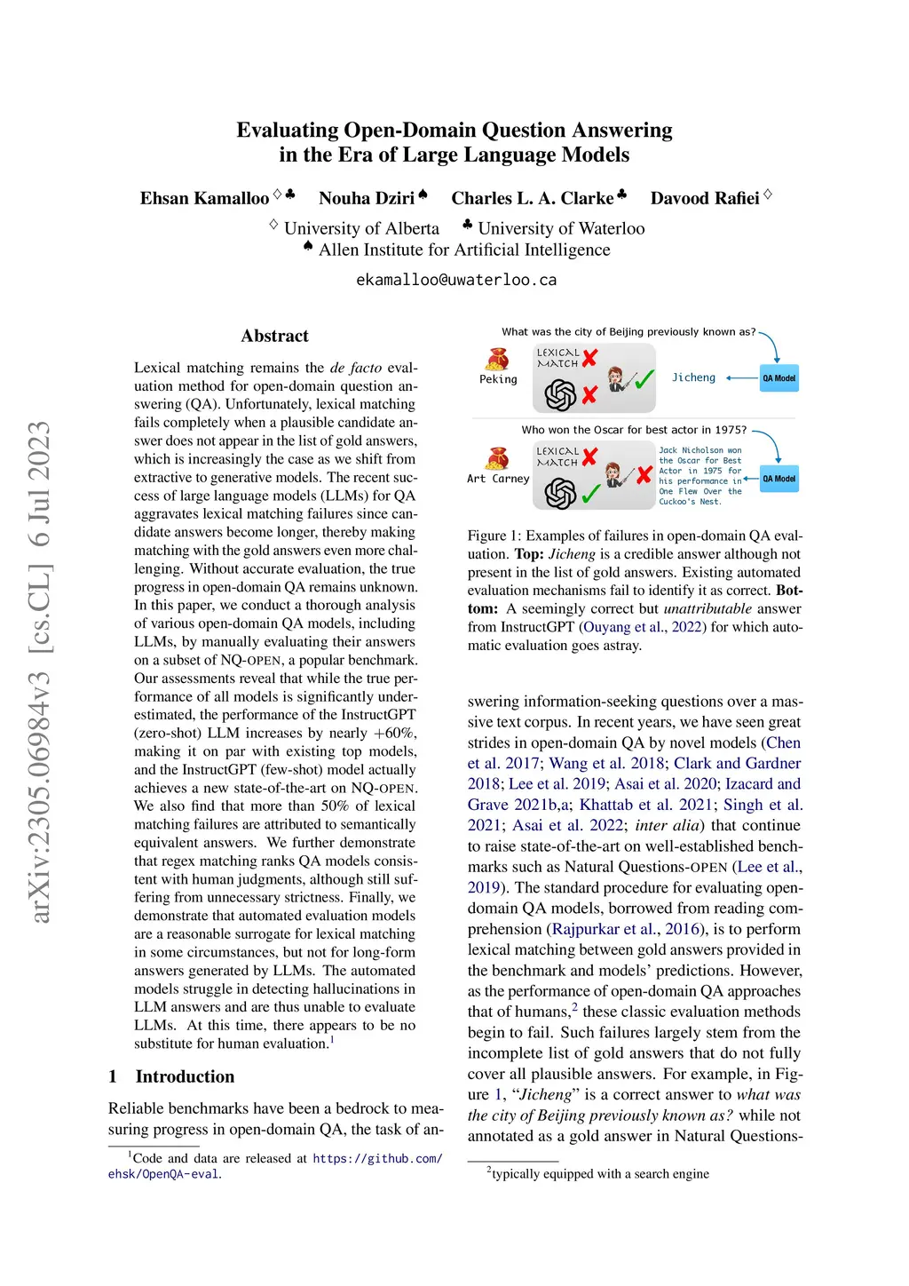 Lexical matching remains the de facto evaluation method for open-domain question answering (QA). Unfortunately, lexical matching fails completely when a plausible candidate answer does not appear in the list of gold answers, which is increasingly the case as we shift from extractive to generative models. The recent success of large language models (LLMs) for QA aggravates lexical matching failures since candidate answers become longer, thereby making matching with the gold answers even more challenging. Without accurate evaluation, the true progress in open-domain QA remains unknown. In this paper, we conduct a thorough analysis of various open-domain QA models, including LLMs, by manually evaluating their answers on a subset of NQ-open, a popular benchmark. Our assessments reveal that while the true performance of all models is significantly underestimated, the performance of the InstructGPT (zero-shot) LLM increases by nearly +60%, making it on par with existing top models, and the InstructGPT (few-shot) model actually achieves a new state-of-the-art on NQ-open. We also find that more than 50% of lexical matching failures are attributed to semantically equivalent answers. We further demonstrate that regex matching ranks QA models consistent with human judgments, although still suffering from unnecessary strictness. Finally, we demonstrate that automated evaluation models are a reasonable surrogate for lexical matching in some circumstances, but not for long-form answers generated by LLMs. The automated models struggle in detecting hallucinations in LLM answers and are thus unable to evaluate LLMs. At this time, there appears to be no substitute for human evaluation.