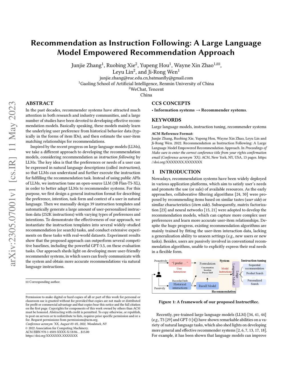 In the past decades, recommender systems have attracted much attention in both research and industry communities, and a large number of studies have been devoted to developing effective recommendation models. Basically speaking, these models mainly learn the underlying user preference from historical behavior data, and then estimate the user-item matching relationships for recommendations. Inspired by the recent progress on large language models (LLMs), we take a different approach to developing the recommendation models, considering recommendation as instruction following by LLMs. The key idea is that the preferences or needs of a user can be expressed in natural language descriptions (called instructions), so that LLMs can understand and further execute the instruction for fulfilling the recommendation task. Instead of using public APIs of LLMs, we instruction tune an open-source LLM (3B Flan-T5-XL), in order to better adapt LLMs to recommender systems. For this purpose, we first design a general instruction format for describing the preference, intention, task form and context of a user in natural language. Then we manually design 39 instruction templates and automatically generate a large amount of user-personalized instruction data (252K instructions) with varying types of preferences and intentions. To demonstrate the effectiveness of our approach, we instantiate the instruction templates into several widely-studied recommendation (or search) tasks, and conduct extensive experiments on these tasks with real-world datasets. Experiment results show that the proposed approach can outperform several competitive baselines, including the powerful GPT-3.5, on these evaluation tasks. Our approach sheds light on developing more user-friendly recommender systems, in which users can freely communicate with the system and obtain more accurate recommendations via natural language instructions.