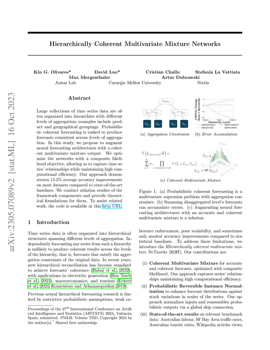 Large collections of time series data are often organized into hierarchies with different levels of aggregation; examples include product and geographical groupings. Probabilistic coherent forecasting is tasked to produce forecasts consistent across levels of aggregation. In this study, we propose to augment neural forecasting architectures with a coherent multivariate mixture output. We optimize the networks with a composite likelihood objective, allowing us to capture time series' relationships while maintaining high computational efficiency. Our approach demonstrates 13.2% average accuracy improvements on most datasets compared to state-of-the-art baselines. We conduct ablation studies of the framework components and provide theoretical foundations for them. To assist related work, the code is available at this https://github.com/Nixtla/neuralforecast.