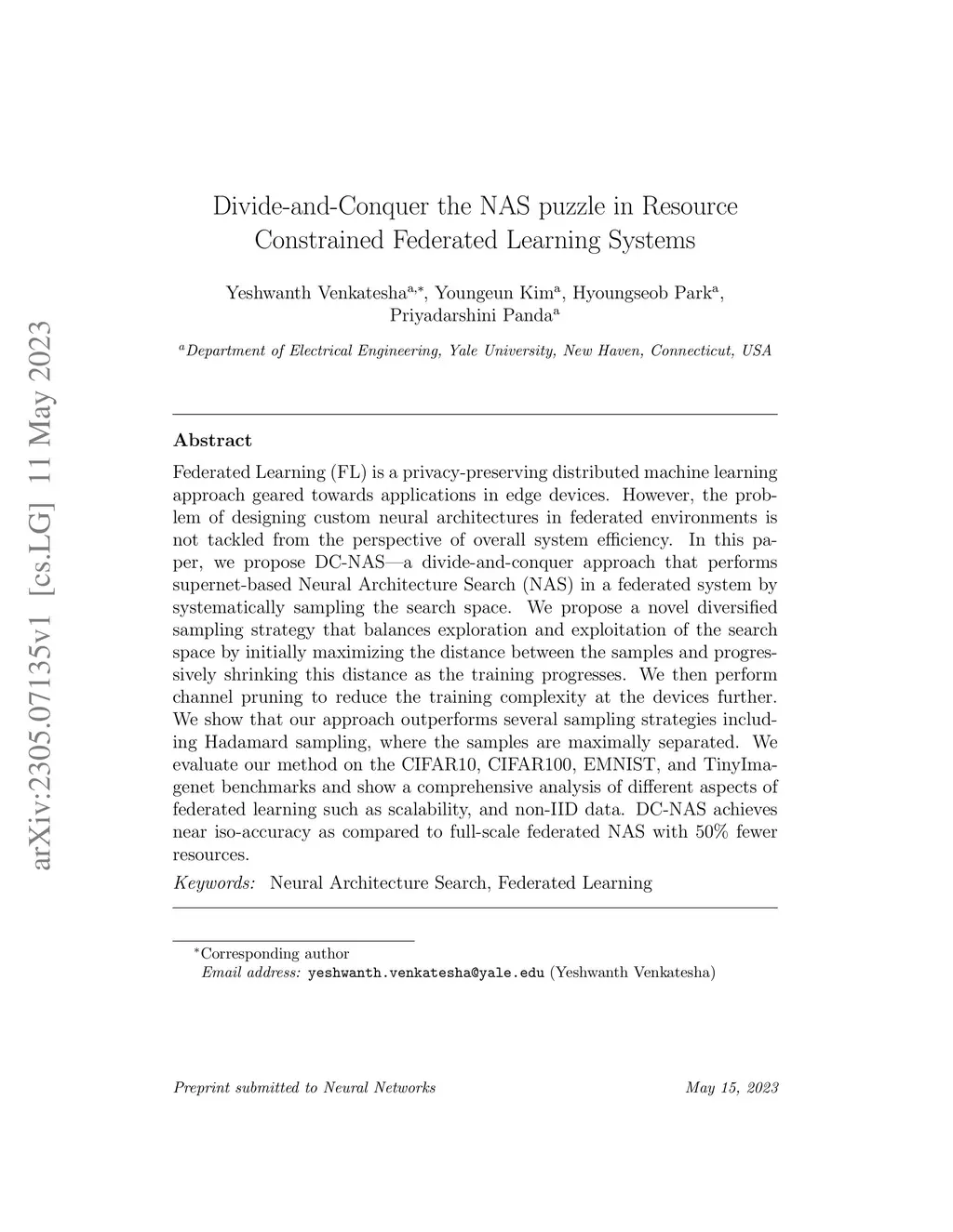 Federated Learning (FL) is a privacy-preserving distributed machine learning approach geared towards applications in edge devices. However, the problem of designing custom neural architectures in federated environments is not tackled from the perspective of overall system efficiency. In this paper, we propose DC-NAS -- a divide-and-conquer approach that performs supernet-based Neural Architecture Search (NAS) in a federated system by systematically sampling the search space. We propose a novel diversified sampling strategy that balances exploration and exploitation of the search space by initially maximizing the distance between the samples and progressively shrinking this distance as the training progresses. We then perform channel pruning to reduce the training complexity at the devices further. We show that our approach outperforms several sampling strategies including Hadamard sampling, where the samples are maximally separated. We evaluate our method on the CIFAR10, CIFAR100, EMNIST, and TinyImagenet benchmarks and show a comprehensive analysis of different aspects of federated learning such as scalability, and non-IID data. DC-NAS achieves near iso-accuracy as compared to full-scale federated NAS with 50% fewer resources.