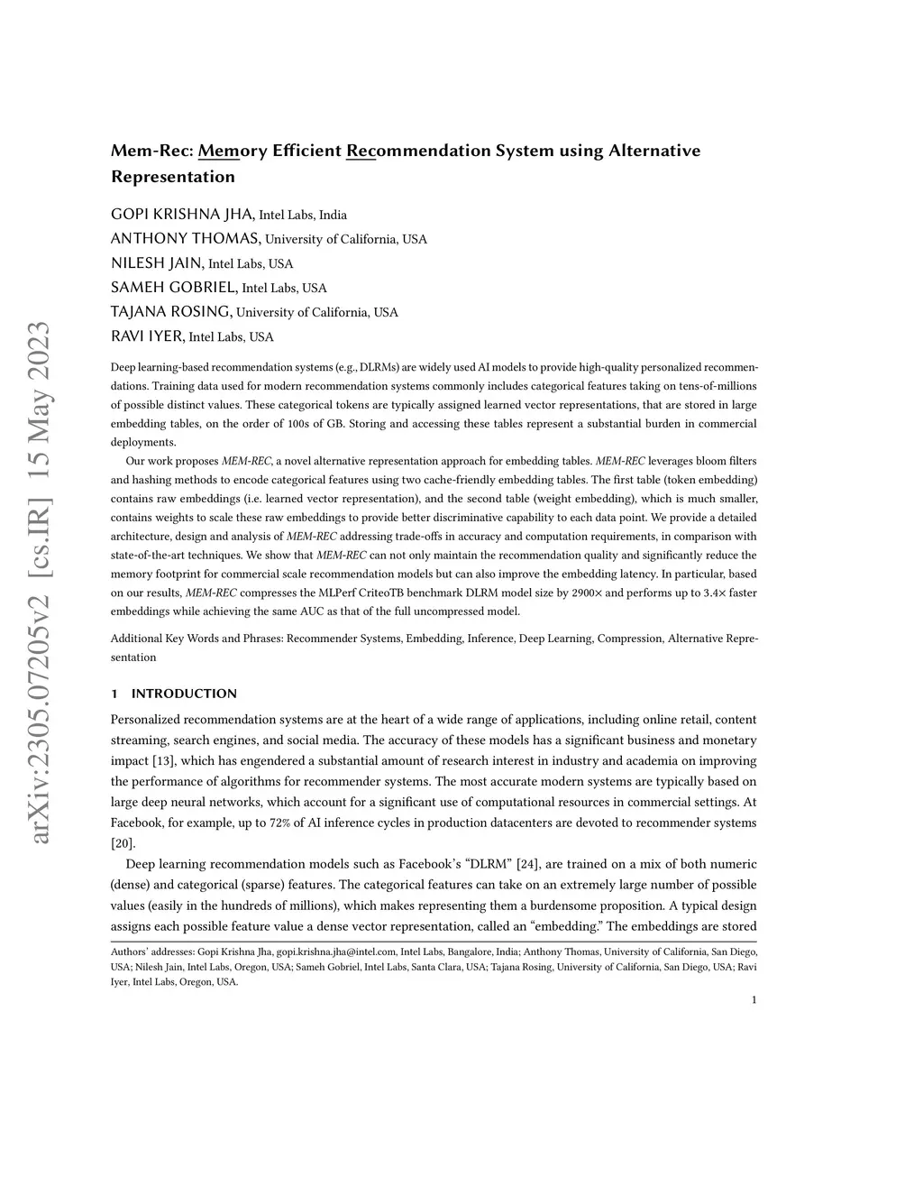 Mem-Rec: Memory Efficient Recommendation System using Alternative