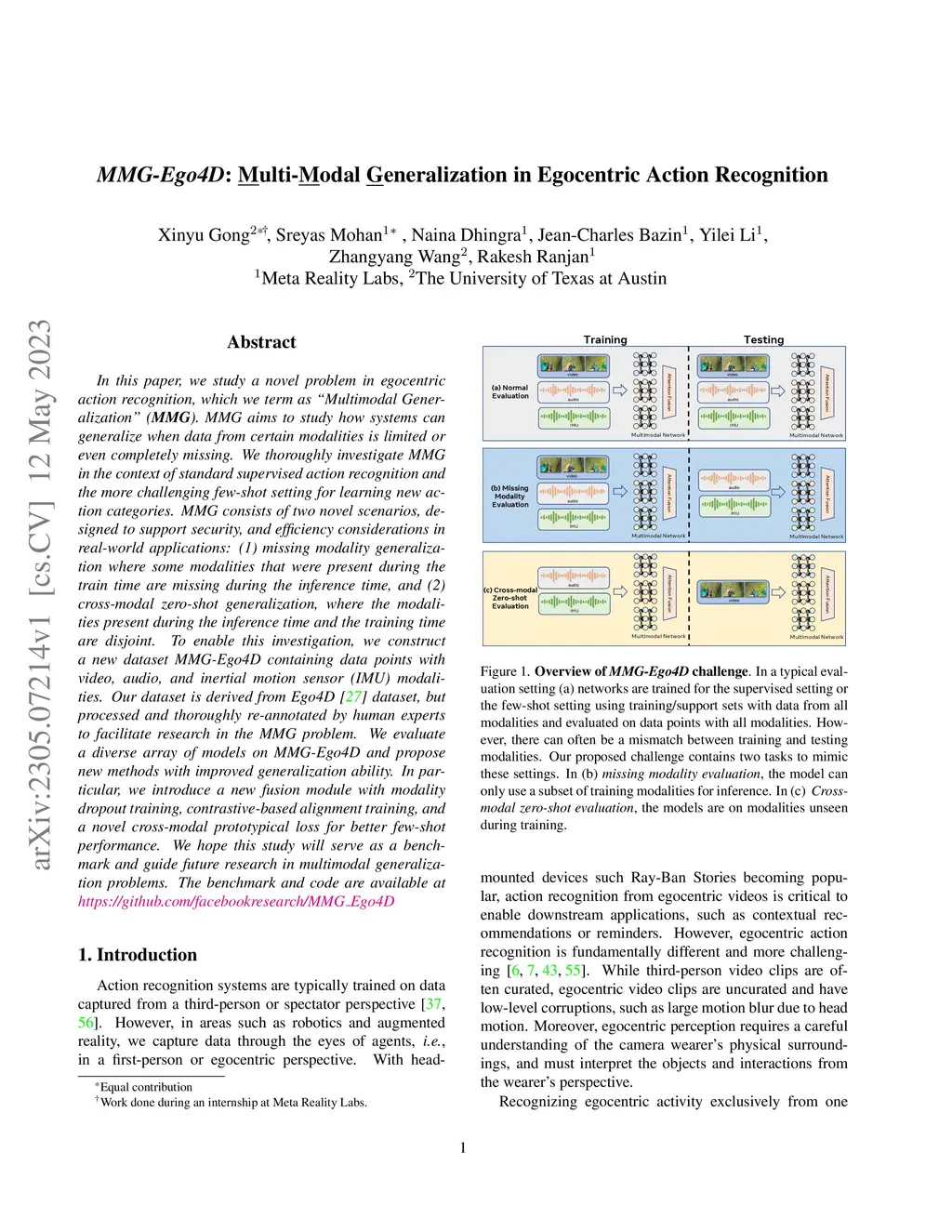 In this paper, we study a novel problem in egocentric action recognition, which we term as "Multimodal Generalization" (MMG). MMG aims to study how systems can generalize when data from certain modalities is limited or even completely missing. We thoroughly investigate MMG in the context of standard supervised action recognition and the more challenging few-shot setting for learning new action categories. MMG consists of two novel scenarios, designed to support security, and efficiency considerations in real-world applications: (1) missing modality generalization where some modalities that were present during the train time are missing during the inference time, and (2) cross-modal zero-shot generalization, where the modalities present during the inference time and the training time are disjoint. To enable this investigation, we construct a new dataset MMG-Ego4D containing data points with video, audio, and inertial motion sensor (IMU) modalities. Our dataset is derived from Ego4D dataset, but processed and thoroughly re-annotated by human experts to facilitate research in the MMG problem. We evaluate a diverse array of models on MMG-Ego4D and propose new methods with improved generalization ability. In particular, we introduce a new fusion module with modality dropout training, contrastive-based alignment training, and a novel cross-modal prototypical loss for better few-shot performance. We hope this study will serve as a benchmark and guide future research in multimodal generalization problems. The benchmark and code will be available at https://github.com/facebookresearch/MMG_Ego4D.