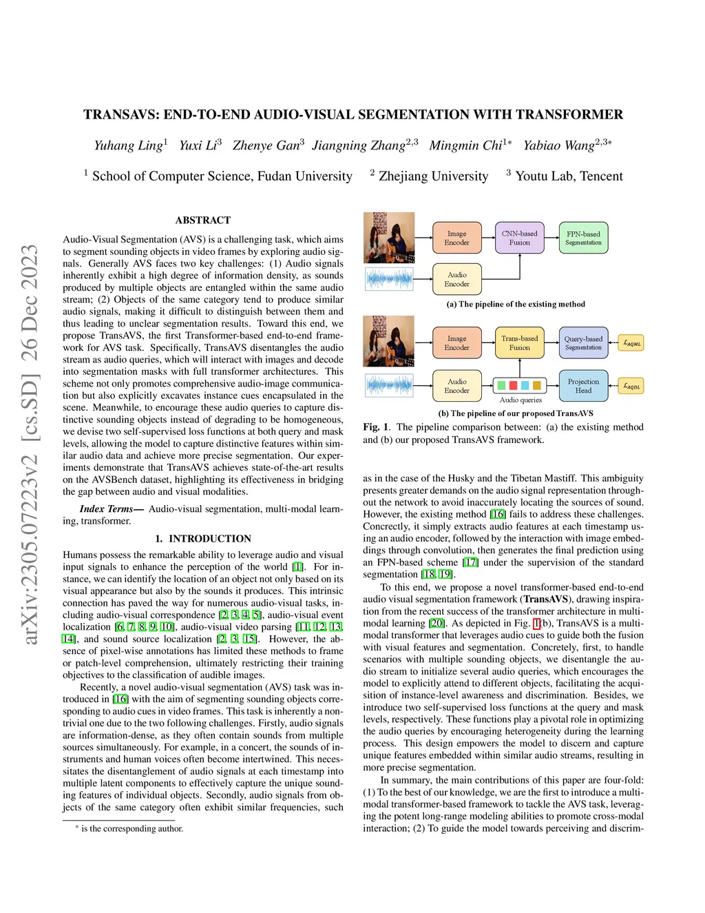 Audio-Visual Segmentation (AVS) is a challenging task, which aims to segment sounding objects in video frames by exploring audio signals. Generally AVS faces two key challenges: (1) Audio signals inherently exhibit a high degree of information density, as sounds produced by multiple objects are entangled within the same audio stream; (2) Objects of the same category tend to produce similar audio signals, making it difficult to distinguish between them and thus leading to unclear segmentation results. Toward this end, we propose TransAVS, the first Transformer-based end-to-end framework for AVS task. Specifically, TransAVS disentangles the audio stream as audio queries, which will interact with images and decode into segmentation masks with full transformer architectures. This scheme not only promotes comprehensive audio-image communication but also explicitly excavates instance cues encapsulated in the scene. Meanwhile, to encourage these audio queries to capture distinctive sounding objects instead of degrading to be homogeneous, we devise two self-supervised loss functions at both query and mask levels, allowing the model to capture distinctive features within similar audio data and achieve more precise segmentation. Our experiments demonstrate that TransAVS achieves state-of-the-art results on the AVSBench dataset, highlighting its effectiveness in bridging the gap between audio and visual modalities.