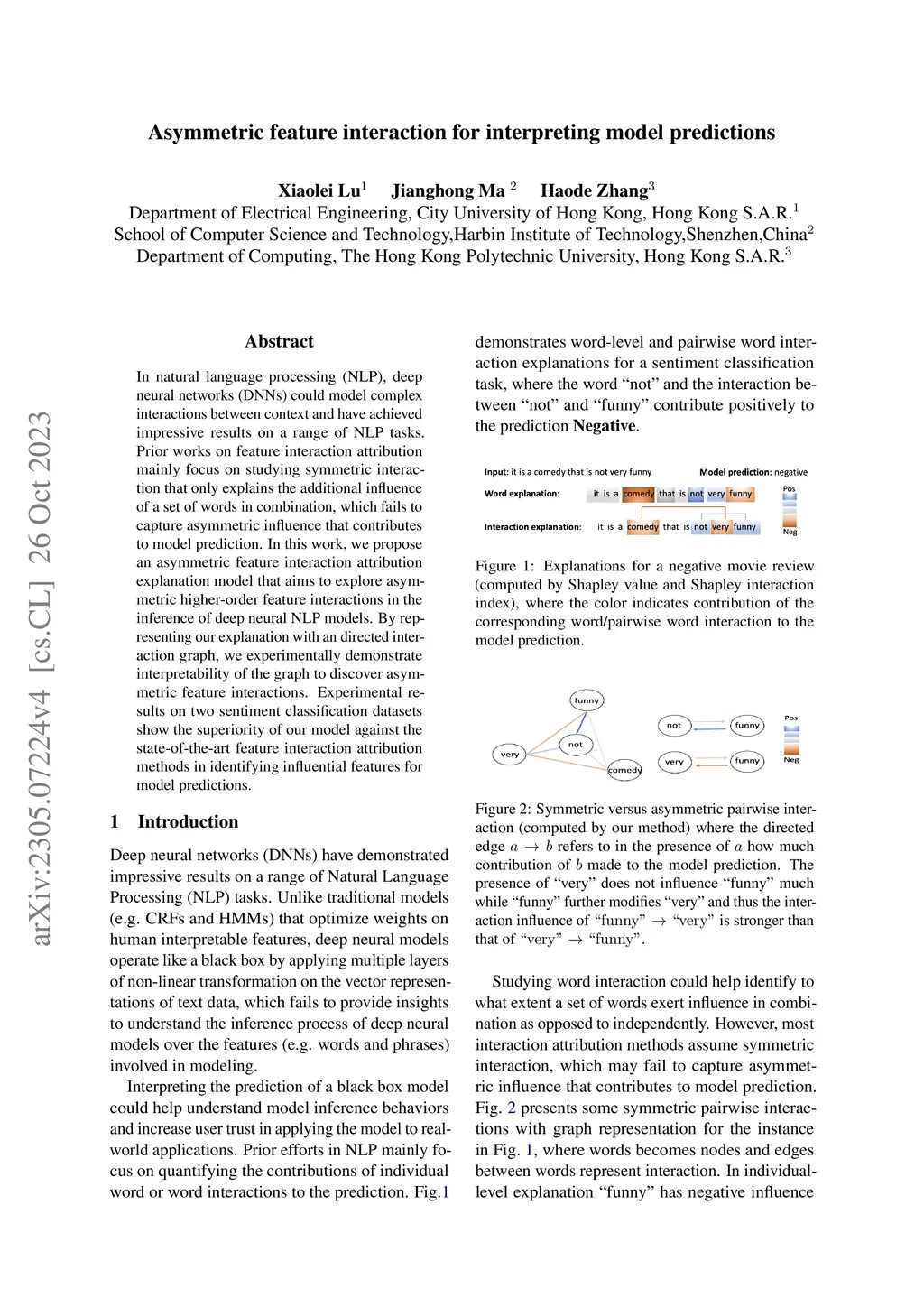 In natural language processing (NLP), deep neural networks (DNNs) could model complex interactions between context and have achieved impressive results on a range of NLP tasks. Prior works on feature interaction attribution mainly focus on studying symmetric interaction that only explains the additional influence of a set of words in combination, which fails to capture asymmetric influence that contributes to model prediction. In this work, we propose an asymmetric feature interaction attribution explanation model that aims to explore asymmetric higher-order feature interactions in the inference of deep neural NLP models. By representing our explanation with an directed interaction graph, we experimentally demonstrate interpretability of the graph to discover asymmetric feature interactions. Experimental results on two sentiment classification datasets show the superiority of our model against the state-of-the-art feature interaction attribution methods in identifying influential features for model predictions. Our code is available at https://github.com/StillLu/ASIV.