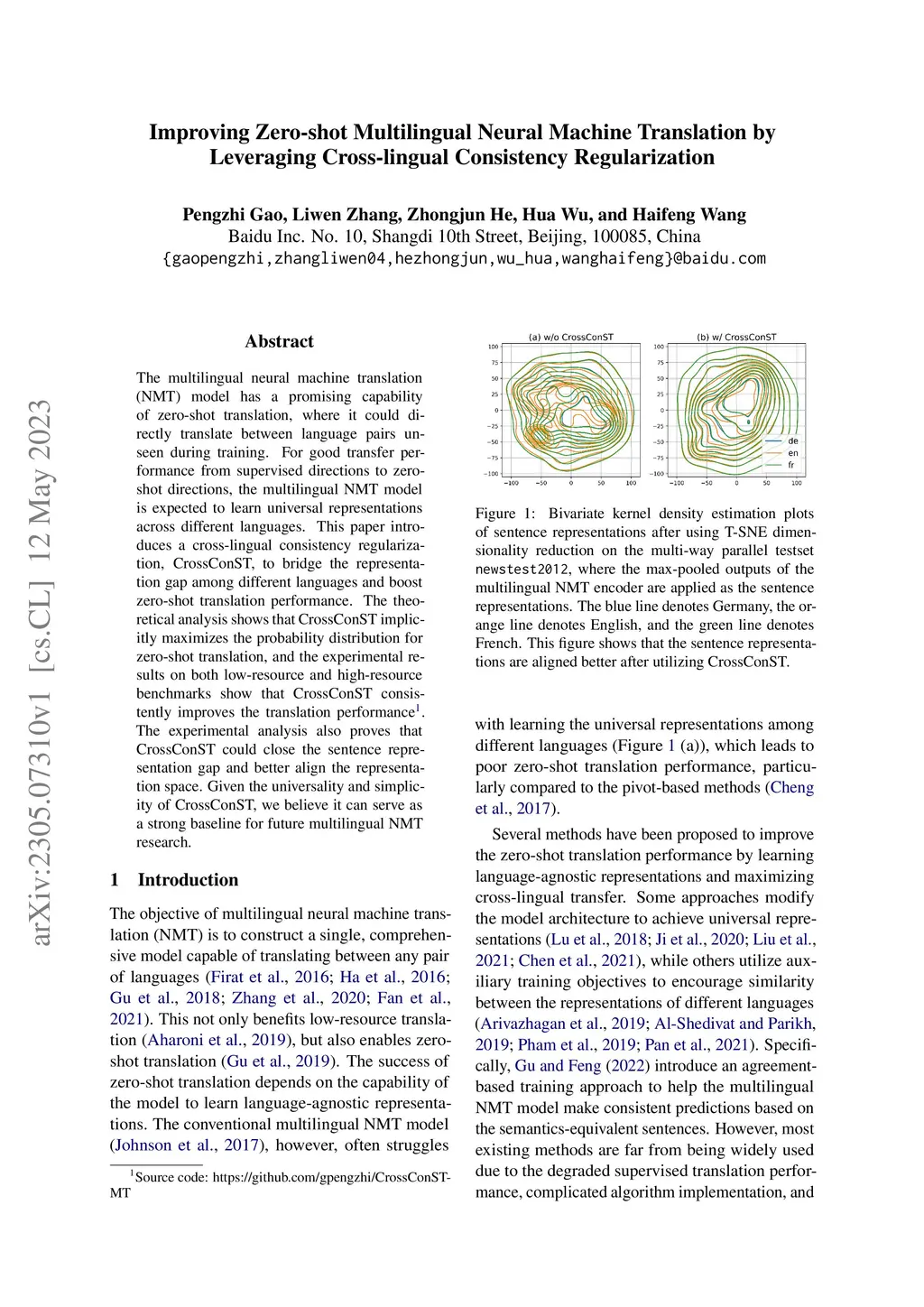The multilingual neural machine translation (NMT) model has a promising capability of zero-shot translation, where it could directly translate between language pairs unseen during training. For good transfer performance from supervised directions to zero-shot directions, the multilingual NMT model is expected to learn universal representations across different languages. This paper introduces a cross-lingual consistency regularization, CrossConST, to bridge the representation gap among different languages and boost zero-shot translation performance. The theoretical analysis shows that CrossConST implicitly maximizes the probability distribution for zero-shot translation, and the experimental results on both low-resource and high-resource benchmarks show that CrossConST consistently improves the translation performance. The experimental analysis also proves that CrossConST could close the sentence representation gap and better align the representation space. Given the universality and simplicity of CrossConST, we believe it can serve as a strong baseline for future multilingual NMT research.
