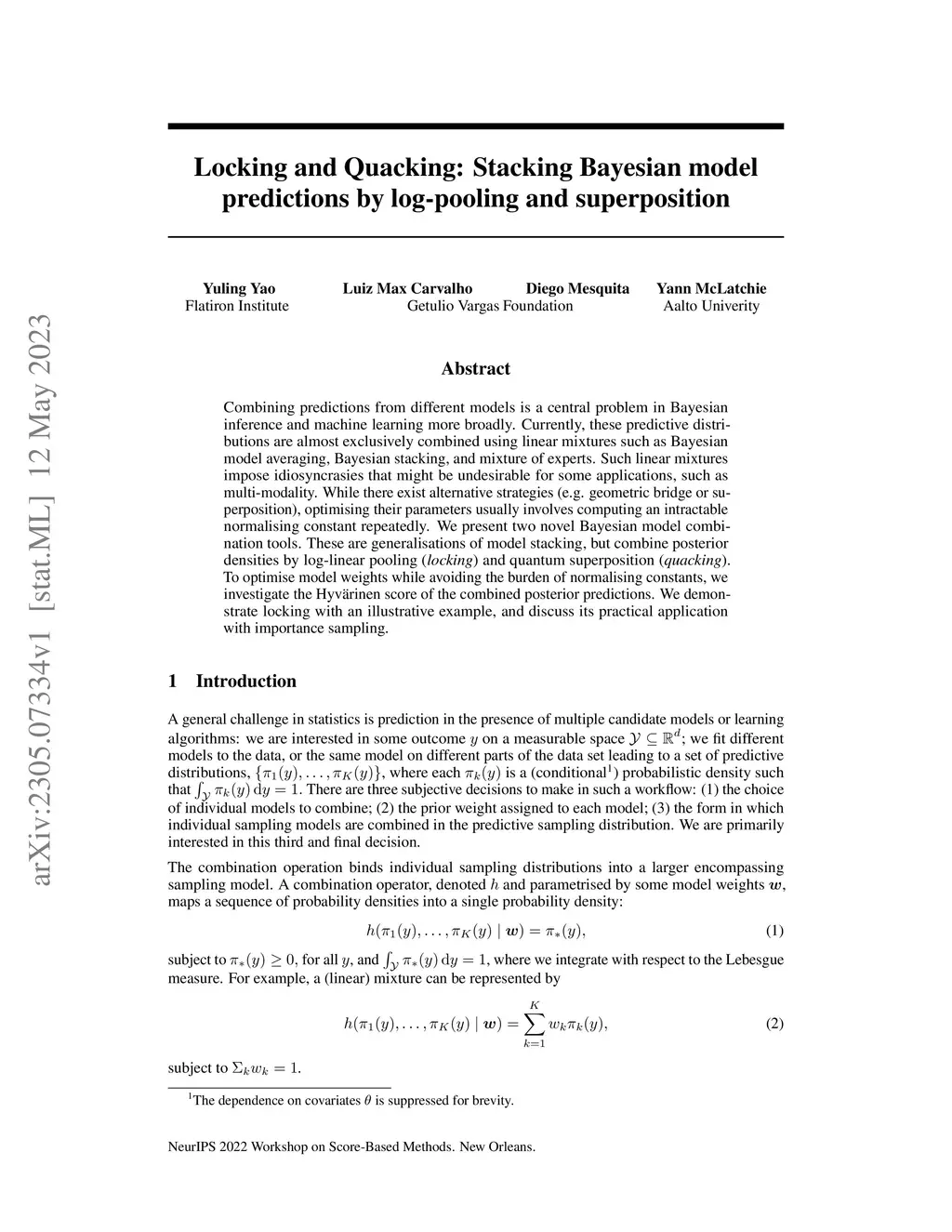 Combining predictions from different models is a central problem in Bayesian inference and machine learning more broadly. Currently, these predictive distributions are almost exclusively combined using linear mixtures such as Bayesian model averaging, Bayesian stacking, and mixture of experts. Such linear mixtures impose idiosyncrasies that might be undesirable for some applications, such as multi-modality. While there exist alternative strategies (e.g. geometric bridge or superposition), optimising their parameters usually involves computing an intractable normalising constant repeatedly. We present two novel Bayesian model combination tools. These are generalisations of model stacking, but combine posterior densities by log-linear pooling (locking) and quantum superposition (quacking). To optimise model weights while avoiding the burden of normalising constants, we investigate the Hyvarinen score of the combined posterior predictions. We demonstrate locking with an illustrative example and discuss its practical application with importance sampling.