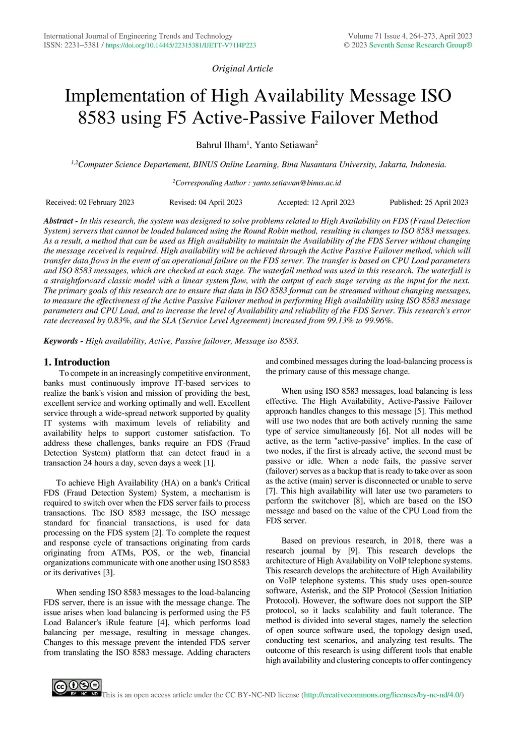 In this research, the system was designed to solve problems related to High Availability on FDS (Fraud Detection System) servers that cannot be loaded balanced using the Round Robin method, resulting in changes to ISO 8583 messages. As a result, a method that can be used as High availability to maintain the Availability of the FDS Server without changing the message received is required. High availability will be achieved through the Active Passive Failover method, which will transfer data flows in the event of an operational failure on the FDS server. The transfer is based on CPU Load parameters and ISO 8583 messages, which are checked at each stage. The waterfall method was used in this research. The waterfall is a straightforward classic model with a linear system flow, with the output of each stage serving as the input for the next. The primary goals of this research are to ensure that data in ISO 8583 format can be streamed without changing messages, to measure the effectiveness of the Active Passive Failover method in performing High availability using ISO 8583 message parameters and CPU Load, and to increase the level of Availability and reliability of the FDS Server. This research's error rate decreased by 0.83%, and the SLA (Service Level Agreement) increased from 99.13% to 99.96%.