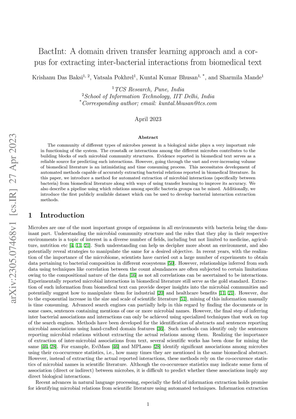 The community of different types of microbes present in a biological niche plays a very important role in functioning of the system. The crosstalk or interactions among the different microbes contributes to the building blocks of such microbial community structures. Evidence reported in biomedical text serves as a reliable source for predicting such interactions. However, going through the vast and ever-increasing volume of biomedical literature is an intimidating and time consuming process. This necessitates development of automated methods capable of accurately extracting bacterial relations reported in biomedical literature. In this paper, we introduce a method for automated extraction of microbial interactions (specifically between bacteria) from biomedical literature along with ways of using transfer learning to improve its accuracy. We also describe a pipeline using which relations among specific bacteria groups can be mined. Additionally, we introduce the first publicly available dataset which can be used to develop bacterial interaction extraction methods.