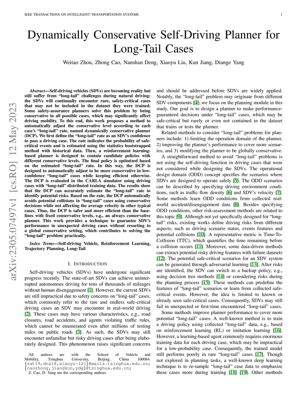 Self-driving vehicles (SDVs) are becoming reality but still suffer from "long-tail" challenges during natural driving: the SDVs will continually encounter rare, safety-critical cases that may not be included in the dataset they were trained. Some safety-assurance planners solve this problem by being conservative in all possible cases, which may significantly affect driving mobility. To this end, this work proposes a method to automatically adjust the conservative level according to each case's "long-tail" rate, named dynamically conservative planner (DCP). We first define the "long-tail" rate as an SDV's confidence to pass a driving case. The rate indicates the probability of safe-critical events and is estimated using the statistics bootstrapped method with historical data. Then, a reinforcement learning-based planner is designed to contain candidate policies with different conservative levels. The final policy is optimized based on the estimated "long-tail" rate. In this way, the DCP is designed to automatically adjust to be more conservative in low-confidence "long-tail" cases while keeping efficient otherwise. The DCP is evaluated in the CARLA simulator using driving cases with "long-tail" distributed training data. The results show that the DCP can accurately estimate the "long-tail" rate to identify potential risks. Based on the rate, the DCP automatically avoids potential collisions in "long-tail" cases using conservative decisions while not affecting the average velocity in other typical cases. Thus, the DCP is safer and more efficient than the baselines with fixed conservative levels, e.g., an always conservative planner. This work provides a technique to guarantee SDV's performance in unexpected driving cases without resorting to a global conservative setting, which contributes to solving the "long-tail" problem practically.