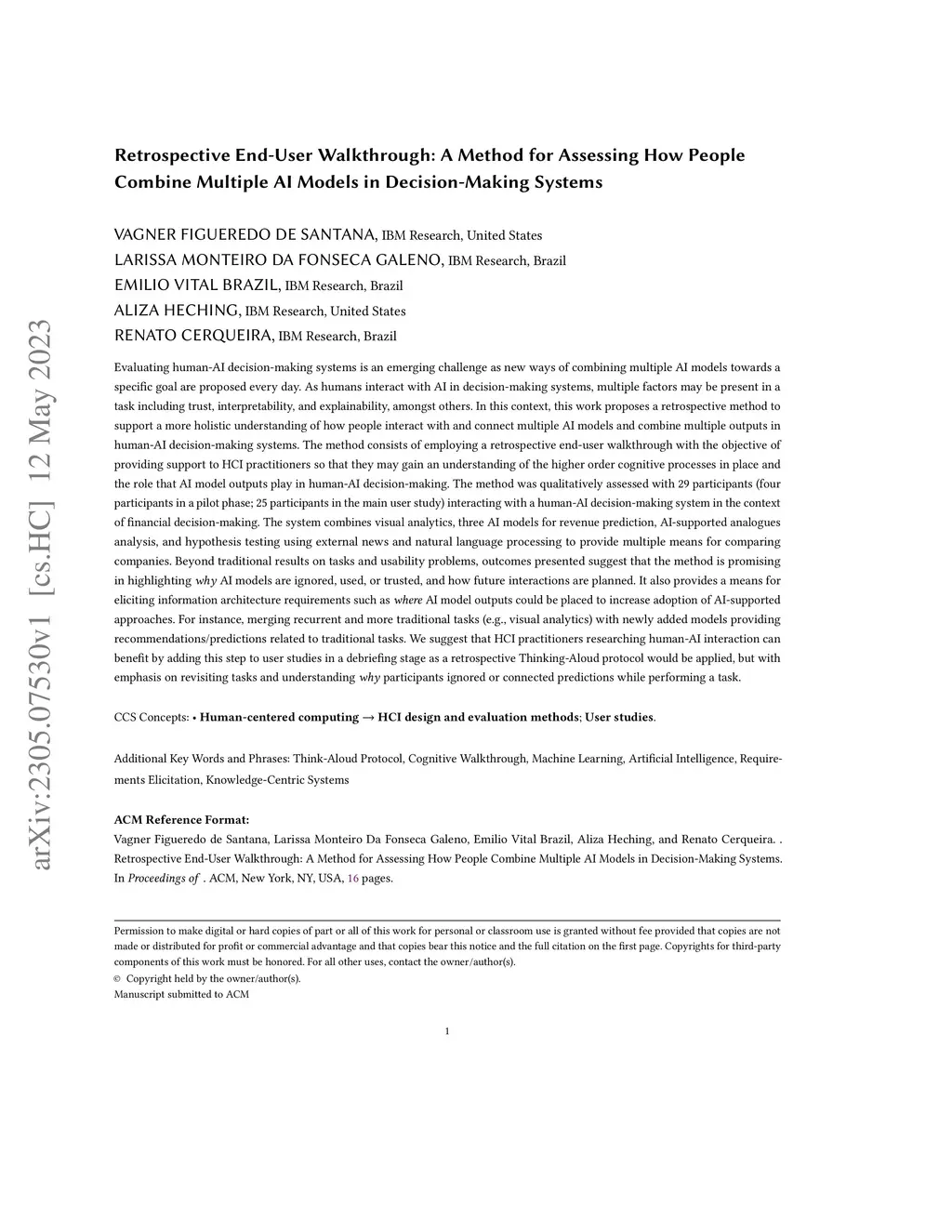 Evaluating human-AI decision-making systems is an emerging challenge as new ways of combining multiple AI models towards a specific goal are proposed every day. As humans interact with AI in decision-making systems, multiple factors may be present in a task including trust, interpretability, and explainability, amongst others. In this context, this work proposes a retrospective method to support a more holistic understanding of how people interact with and connect multiple AI models and combine multiple outputs in human-AI decision-making systems. The method consists of employing a retrospective end-user walkthrough with the objective of providing support to HCI practitioners so that they may gain an understanding of the higher order cognitive processes in place and the role that AI model outputs play in human-AI decision-making. The method was qualitatively assessed with 29 participants (four participants in a pilot phase; 25 participants in the main user study) interacting with a human-AI decision-making system in the context of financial decision-making. The system combines visual analytics, three AI models for revenue prediction, AI-supported analogues analysis, and hypothesis testing using external news and natural language processing to provide multiple means for comparing companies. Beyond results on tasks and usability problems, outcomes presented suggest that the method is promising in highlighting why AI models are ignored, used, or trusted, and how future interactions are planned. We suggest that HCI practitioners researching human-AI interaction can benefit by adding this step to user studies in a debriefing stage as a retrospective Thinking-Aloud protocol would be applied, but with emphasis on revisiting tasks and understanding why participants ignored or connected predictions while performing a task.