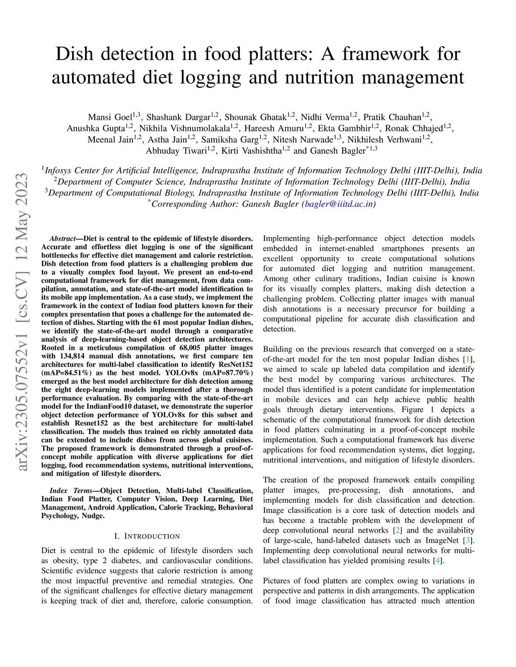 Diet is central to the epidemic of lifestyle disorders. Accurate and effortless diet logging is one of the significant bottlenecks for effective diet management and calorie restriction. Dish detection from food platters is a challenging problem due to a visually complex food layout. We present an end-to-end computational framework for diet management, from data compilation, annotation, and state-of-the-art model identification to its mobile app implementation. As a case study, we implement the framework in the context of Indian food platters known for their complex presentation that poses a challenge for the automated detection of dishes. Starting with the 61 most popular Indian dishes, we identify the state-of-the-art model through a comparative analysis of deep-learning-based object detection architectures. Rooted in a meticulous compilation of 68,005 platter images with 134,814 manual dish annotations, we first compare ten architectures for multi-label classification to identify ResNet152 (mAP=84.51%) as the best model. YOLOv8x (mAP=87.70%) emerged as the best model architecture for dish detection among the eight deep-learning models implemented after a thorough performance evaluation. By comparing with the state-of-the-art model for the IndianFood10 dataset, we demonstrate the superior object detection performance of YOLOv8x for this subset and establish Resnet152 as the best architecture for multi-label classification. The models thus trained on richly annotated data can be extended to include dishes from across global cuisines. The proposed framework is demonstrated through a proof-of-concept mobile application with diverse applications for diet logging, food recommendation systems, nutritional interventions, and mitigation of lifestyle disorders.