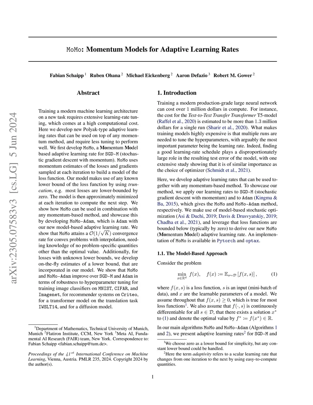 Training a modern machine learning architecture on a new task requires extensive learning-rate tuning, which comes at a high computational cost. Here we develop new Polyak-type adaptive learning rates that can be used on top of any momentum method, and require less tuning to perform well. We first develop MoMo, a Momentum Model based adaptive learning rate for SGD-M (stochastic gradient descent with momentum). MoMo uses momentum estimates of the losses and gradients sampled at each iteration to build a model of the loss function. Our model makes use of any known lower bound of the loss function by using truncation, e.g. most losses are lower-bounded by zero. The model is then approximately minimized at each iteration to compute the next step. We show how MoMo can be used in combination with any momentum-based method, and showcase this by developing MoMo-Adam, which is Adam with our new model-based adaptive learning rate. We show that MoMo attains a convergence rate for convex problems with interpolation, needing knowledge of no problem-specific quantities other than the optimal value. Additionally, for losses with unknown lower bounds, we develop on-the-fly estimates of a lower bound, that are incorporated in our model. We show that MoMo and MoMo-Adam improve over SGD-M and Adam in terms of robustness to hyperparameter tuning for training image classifiers on MNIST, CIFAR, and Imagenet, for recommender systems on Criteo, for a transformer model on the translation task IWSLT14, and for a diffusion model.