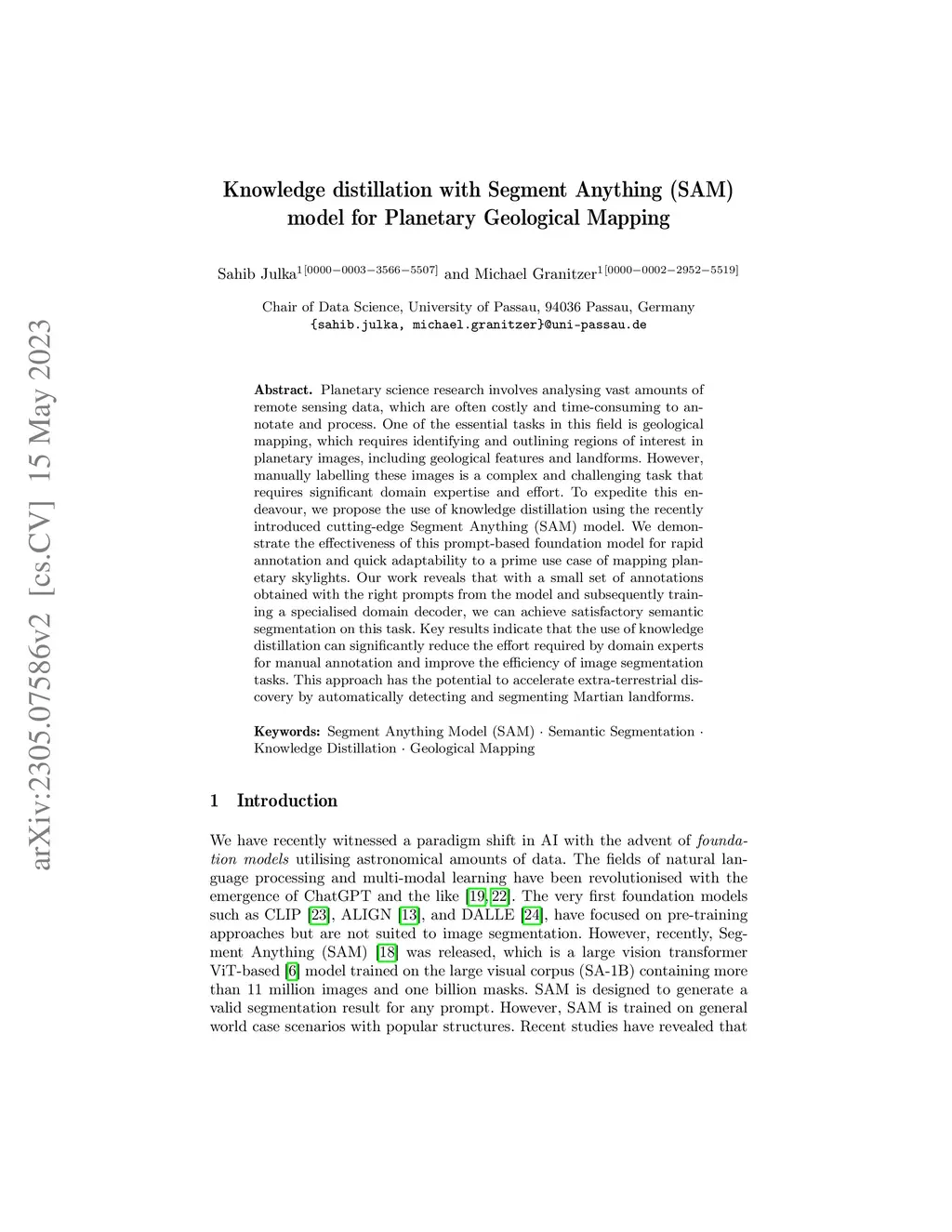 Planetary science research involves analysing vast amounts of remote sensing data, which are often costly and time-consuming to annotate and process. One of the essential tasks in this field is geological mapping, which requires identifying and outlining regions of interest in planetary images, including geological features and landforms. However, manually labelling these images is a complex and challenging task that requires significant domain expertise and effort. To expedite this endeavour, we propose the use of knowledge distillation using the recently introduced cutting-edge Segment Anything (SAM) model. We demonstrate the effectiveness of this prompt-based foundation model for rapid annotation and quick adaptability to a prime use case of mapping planetary skylights. Our work reveals that with a small set of annotations obtained with the right prompts from the model and subsequently training a specialised domain decoder, we can achieve satisfactory semantic segmentation on this task. Key results indicate that the use of knowledge distillation can significantly reduce the effort required by domain experts for manual annotation and improve the efficiency of image segmentation tasks. This approach has the potential to accelerate extra-terrestrial discovery by automatically detecting and segmenting Martian landforms.