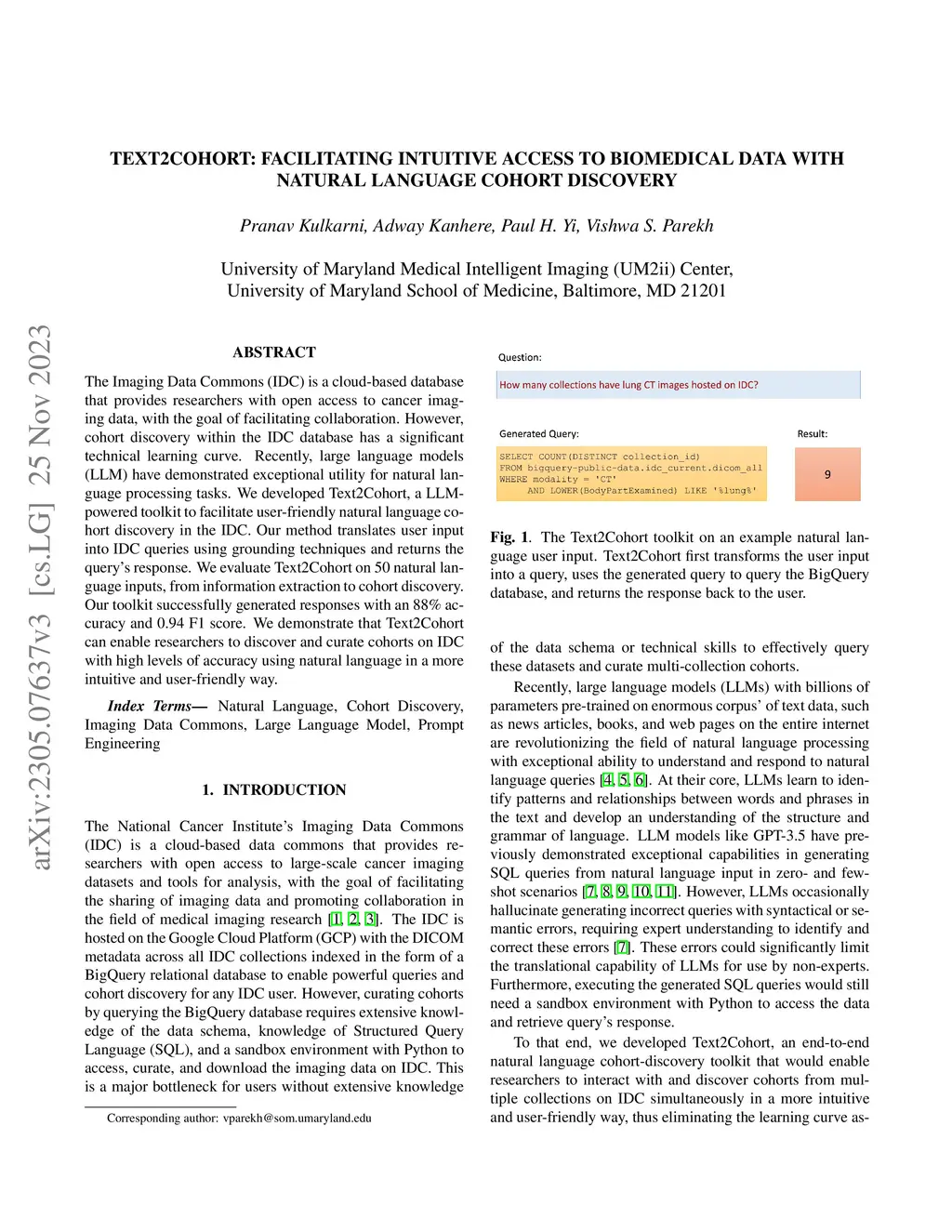 The Imaging Data Commons (IDC) is a cloud-based database that provides researchers with open access to cancer imaging data, with the goal of facilitating collaboration in medical imaging research. However, querying the IDC database for cohort discovery and access to imaging data has a significant learning curve for researchers due to its complex nature. We developed Text2Cohort, a large language model (LLM) based toolkit to facilitate user-friendly and intuitive natural language cohort discovery in the IDC. Text2Cohorts translates user input into IDC database queries using prompt engineering and autocorrection and returns the query's response to the user. Autocorrection resolves errors in queries by passing the errors back to the model for interpretation and correction. We evaluate Text2Cohort on 50 natural language user inputs ranging from information extraction to cohort discovery. The resulting queries and outputs were verified by two computer scientists to measure Text2Cohort's accuracy and F1 score. Text2Cohort successfully generated queries and their responses with an 88% accuracy and F1 score of 0.94. However, it failed to generate queries for 6/50 (12%) user inputs due to syntax and semantic errors. Our results indicate that Text2Cohort succeeded at generating queries with correct responses, but occasionally failed due to a lack of understanding of the data schema. Despite these shortcomings, Text2Cohort demonstrates the utility of LLMs to enable researchers to discover and curate cohorts using data hosted on IDC with high levels of accuracy using natural language in a more intuitive and user-friendly way.
