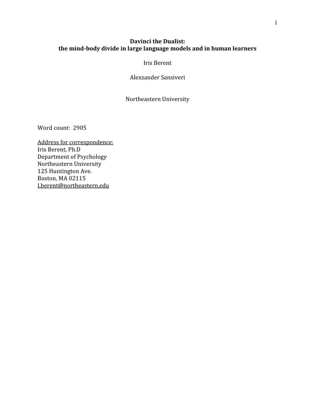 A large literature suggests that people are intuitive Dualists--they consider the mind ethereal, distinct from the body. Past research also shows that Dualism emerges, in part, via learning (e.g., Barlev & Shtulman, 2021). But whether learning is sufficient to give rise to Dualism is unknown.The evidence from human learners does address this question because humans are endowed not only with general learning capacities but also with core knowledge capacities. And recent results suggest that core knowledge begets Dualism (Berent, Theodore & Valencia, 2021; Berent, 2023). To evaluate the role of learning, here, we probe for a mind-body divide in Davinci--a large language model (LLM) that is devoid of any innate core knowledge. We show that Davinci still leans towards Dualism, and that this bias increases systematically with the learner's inductive potential. Thus, davinci (a GPT-3 model) exhibits mild Dualist tendencies, whereas its descendent, text-davinci-003 (a GPT-3.5 model), shows a full-blown bias. It selectively considers thoughts (epistemic states) as disembodied--as unlikely to show up in the body (in the brain), but not in its absence (after death). While Davinci's performance is constrained by its syntactic limitations, and it differs from humans, its Dualist bias is robust. These results demonstrate that the mind-body divide is partly learnable from experience.They also show how, as LLM's are exposed to human narratives, they induce not only human knowledge but also human biases.