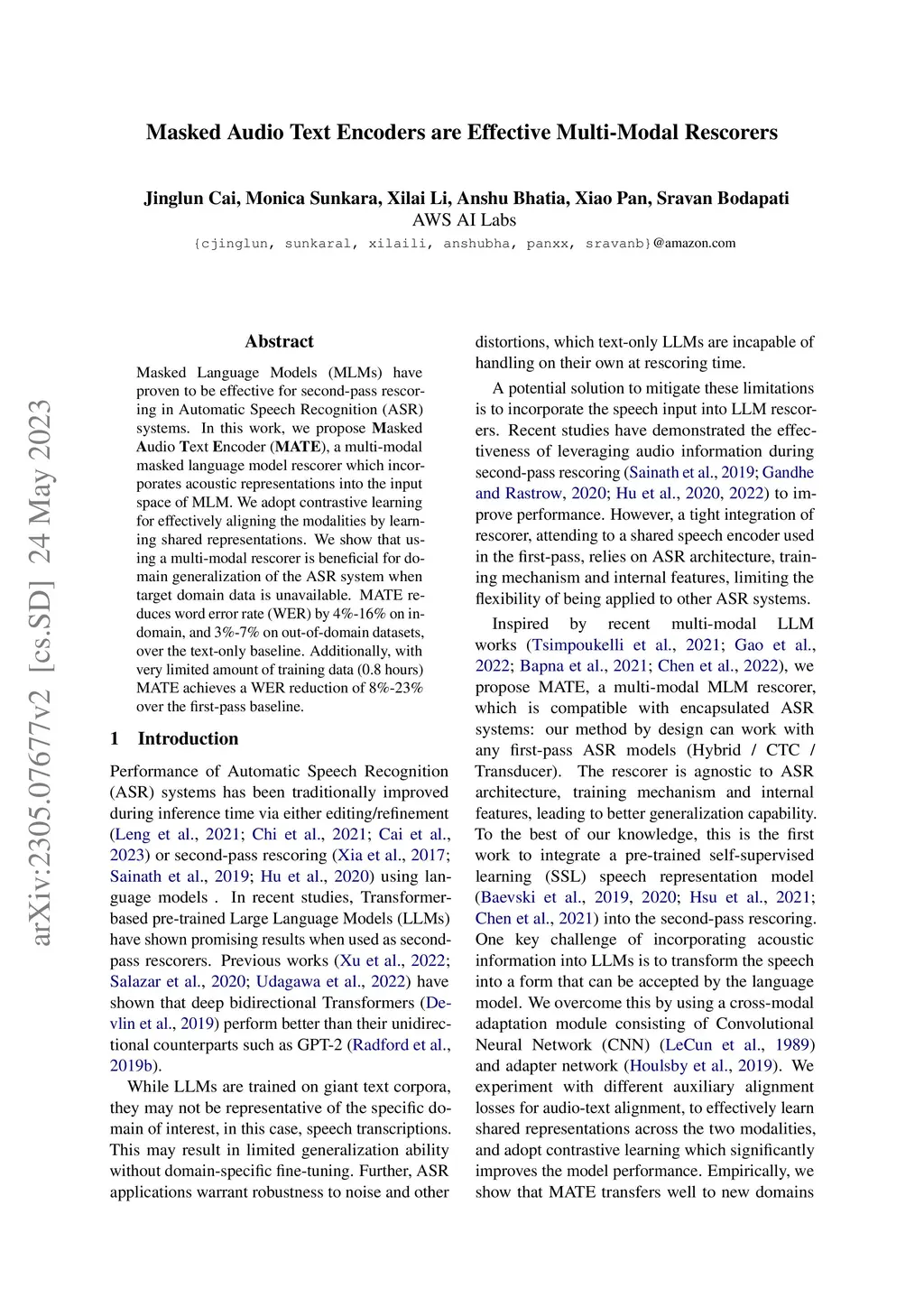 Masked Language Models (MLMs) have proven to be effective for second-pass rescoring in Automatic Speech Recognition (ASR) systems. In this work, we propose Masked Audio Text Encoder (MATE), a multi-modal masked language model rescorer which incorporates acoustic representations into the input space of MLM. We adopt contrastive learning for effectively aligning the modalities by learning shared representations. We show that using a multi-modal rescorer is beneficial for domain generalization of the ASR system when target domain data is unavailable. MATE reduces word error rate (WER) by 4%-16% on in-domain, and 3%-7% on out-of-domain datasets, over the text-only baseline. Additionally, with very limited amount of training data (0.8 hours), MATE achieves a WER reduction of 8%-23% over the first-pass baseline.