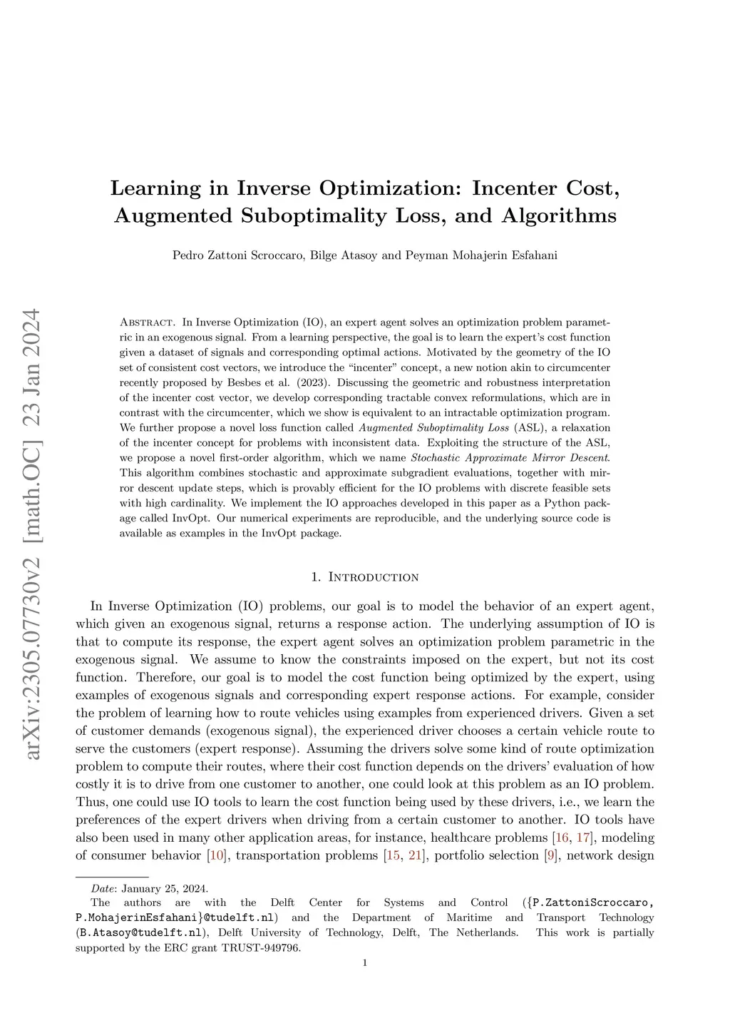 In Inverse Optimization (IO), an expert agent solves an optimization problem parametric in an exogenous signal. From a learning perspective, the goal is to learn the expert's cost function given a dataset of signals and corresponding optimal actions. Motivated by the geometry of the IO set of consistent cost vectors, we introduce the "incenter" concept, a new notion akin to circumcenter recently proposed by Besbes et al. (2023). Discussing the geometric and robustness interpretation of the incenter cost vector, we develop corresponding tractable convex reformulations, which are in contrast with the circumcenter, which we show is equivalent to an intractable optimization program. We further propose a novel loss function called Augmented Suboptimality Loss (ASL), a relaxation of the incenter concept for problems with inconsistent data. Exploiting the structure of the ASL, we propose a novel first-order algorithm, which we name Stochastic Approximate Mirror Descent. This algorithm combines stochastic and approximate subgradient evaluations, together with mirror descent update steps, which is provably efficient for the IO problems with discrete feasible sets with high cardinality. We implement the IO approaches developed in this paper as a Python package called InvOpt. Our numerical experiments are reproducible, and the underlying source code is available as examples in the InvOpt package.