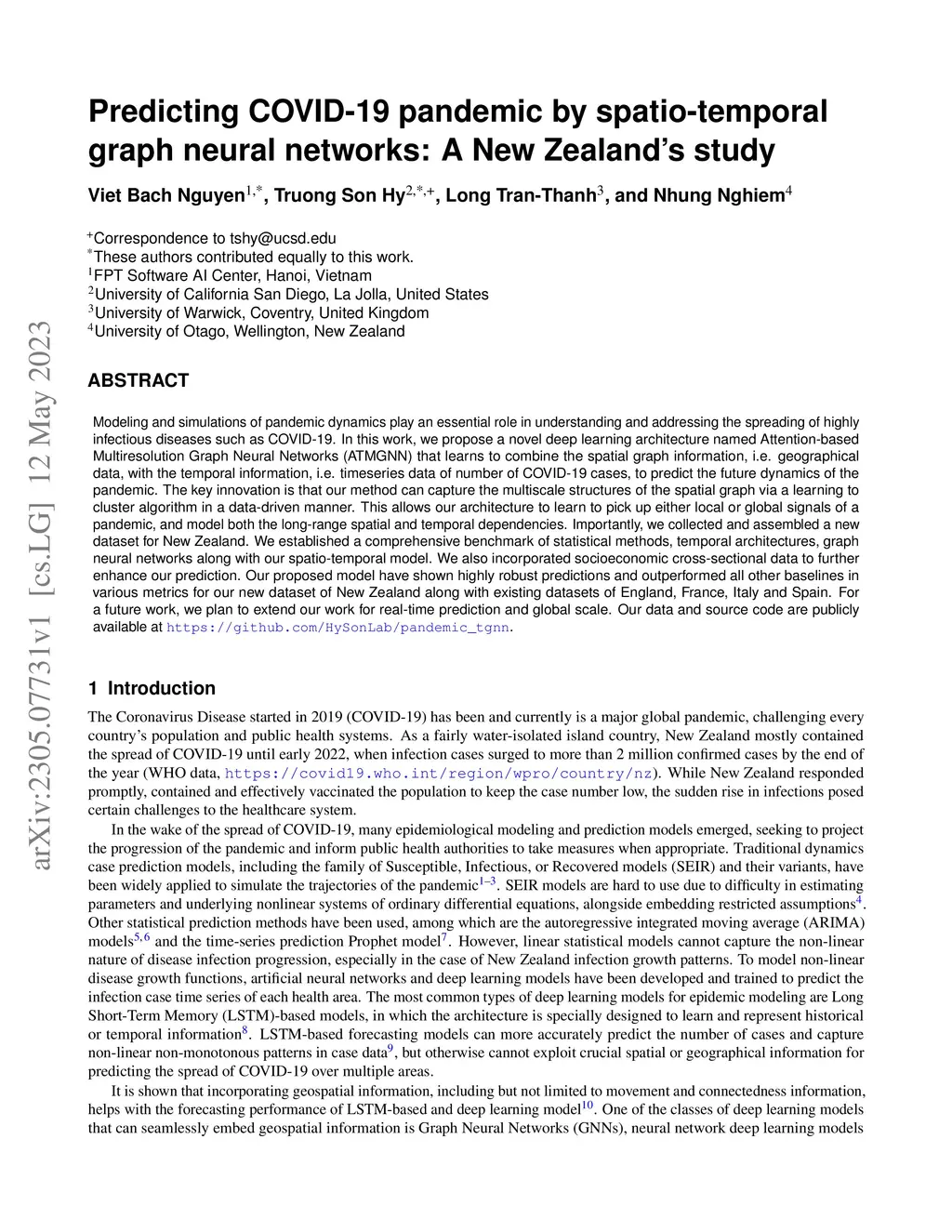 Modeling and simulations of pandemic dynamics play an essential role in understanding and addressing the spreading of highly infectious diseases such as COVID-19. In this work, we propose a novel deep learning architecture named Attention-based Multiresolution Graph Neural Networks (ATMGNN) that learns to combine the spatial graph information, i.e. geographical data, with the temporal information, i.e. timeseries data of number of COVID-19 cases, to predict the future dynamics of the pandemic. The key innovation is that our method can capture the multiscale structures of the spatial graph via a learning to cluster algorithm in a data-driven manner. This allows our architecture to learn to pick up either local or global signals of a pandemic, and model both the long-range spatial and temporal dependencies. Importantly, we collected and assembled a new dataset for New Zealand. We established a comprehensive benchmark of statistical methods, temporal architectures, graph neural networks along with our spatio-temporal model. We also incorporated socioeconomic cross-sectional data to further enhance our prediction. Our proposed model have shown highly robust predictions and outperformed all other baselines in various metrics for our new dataset of New Zealand along with existing datasets of England, France, Italy and Spain. For a future work, we plan to extend our work for real-time prediction and global scale. Our data and source code are publicly available at https://github.com/HySonLab/pandemic_tgnn