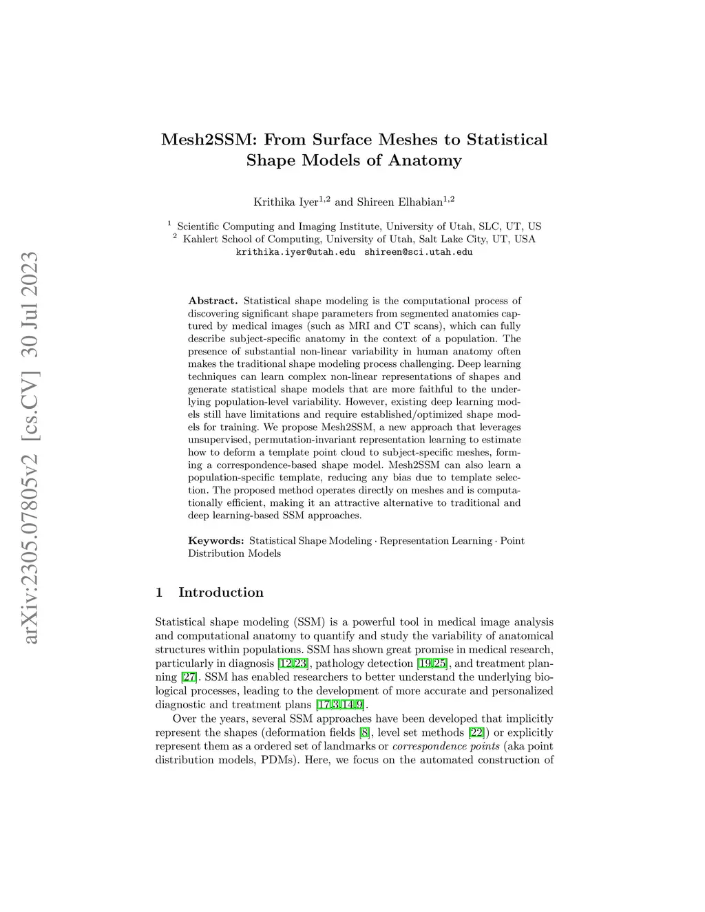Statistical shape modeling is the computational process of discovering significant shape parameters from segmented anatomies captured by medical images (such as MRI and CT scans), which can fully describe subject-specific anatomy in the context of a population. The presence of substantial non-linear variability in human anatomy often makes the traditional shape modeling process challenging. Deep learning techniques can learn complex non-linear representations of shapes and generate statistical shape models that are more faithful to the underlying population-level variability. However, existing deep learning models still have limitations and require established/optimized shape models for training. We propose Mesh2SSM, a new approach that leverages unsupervised, permutation-invariant representation learning to estimate how to deform a template point cloud to subject-specific meshes, forming a correspondence-based shape model. Mesh2SSM can also learn a population-specific template, reducing any bias due to template selection. The proposed method operates directly on meshes and is computationally efficient, making it an attractive alternative to traditional and deep learning-based SSM approaches.