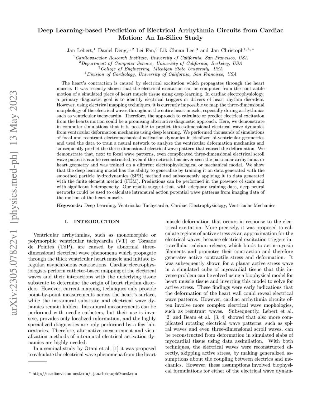 The heart's contraction is caused by electrical excitation which propagates through the heart muscle. It was recently shown that the electrical excitation can be computed from the contractile motion of a simulated piece of heart muscle tissue using deep learning. In cardiac electrophysiology, a primary diagnostic goal is to identify electrical triggers or drivers of heart rhythm disorders. However, using electrical mapping techniques, it is currently impossible to map the three-dimensional morphology of the electrical waves throughout the entire heart muscle, especially during ventricular arrhythmias. Therefore, the approach to calculate or predict electrical excitation from the hearts motion could be a promising alternative diagnostic approach. Here, we demonstrate in computer simulations that it is possible to predict three-dimensional electrical wave dynamics from ventricular deformation mechanics using deep learning. We performed thousands of simulations of electromechanical activation dynamics in ventricular geometries and used the data to train a neural network which subsequently predicts the three-dimensional electrical wave pattern that caused the deformation. We demonstrate that, next to focal wave patterns, even complicated three-dimensional electrical wave patterns can be reconstructed, even if the network has never seen the particular arrhythmia. We show that the deep learning model has the ability to generalize by training it on data generated with the smoothed particle hydrodynamics (SPH) method and subsequently applying it to data generated with the finite element method (FEM). Predictions can be performed in the presence of scars and with significant heterogeneity. Our results suggest that, deep neural networks could be used to calculate intramural action potential wave patterns from imaging data of the motion of the heart muscle.