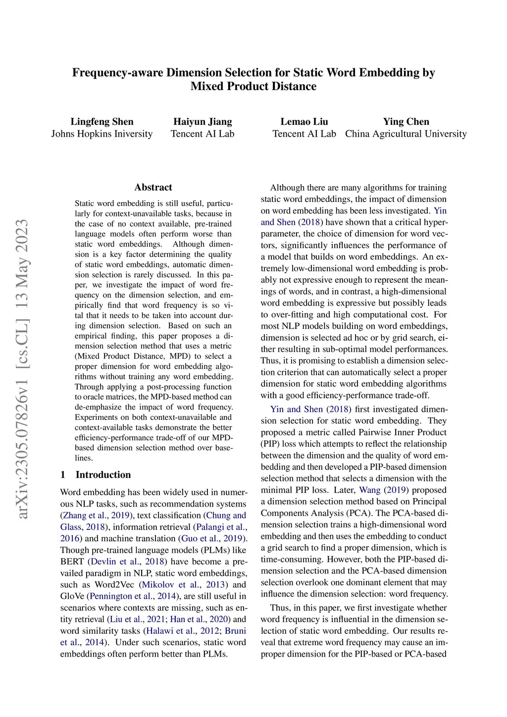Static word embedding is still useful, particularly for context-unavailable tasks, because in the case of no context available, pre-trained language models often perform worse than static word embeddings. Although dimension is a key factor determining the quality of static word embeddings, automatic dimension selection is rarely discussed. In this paper, we investigate the impact of word frequency on the dimension selection, and empirically find that word frequency is so vital that it needs to be taken into account during dimension selection. Based on such an empirical finding, this paper proposes a dimension selection method that uses a metric (Mixed Product Distance, MPD) to select a proper dimension for word embedding algorithms without training any word embedding. Through applying a post-processing function to oracle matrices, the MPD-based method can de-emphasize the impact of word frequency. Experiments on both context-unavailable and context-available tasks demonstrate the better efficiency-performance trade-off of our MPD-based dimension selection method over baselines.
