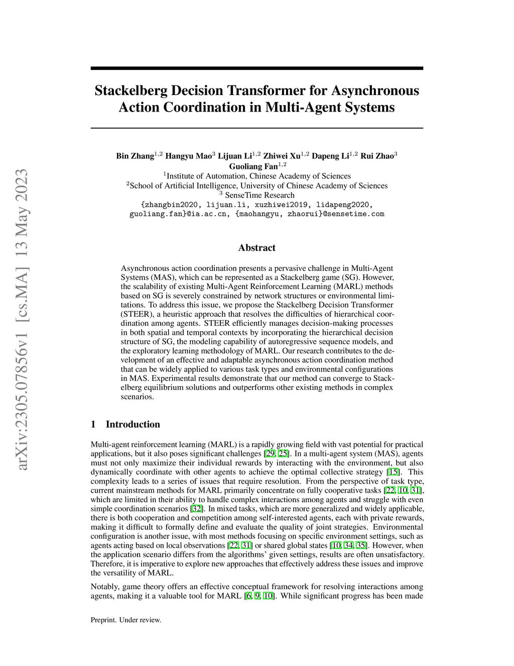 Asynchronous action coordination presents a pervasive challenge in Multi-Agent Systems (MAS), which can be represented as a Stackelberg game (SG). However, the scalability of existing Multi-Agent Reinforcement Learning (MARL) methods based on SG is severely constrained by network structures or environmental limitations. To address this issue, we propose the Stackelberg Decision Transformer (STEER), a heuristic approach that resolves the difficulties of hierarchical coordination among agents. STEER efficiently manages decision-making processes in both spatial and temporal contexts by incorporating the hierarchical decision structure of SG, the modeling capability of autoregressive sequence models, and the exploratory learning methodology of MARL. Our research contributes to the development of an effective and adaptable asynchronous action coordination method that can be widely applied to various task types and environmental configurations in MAS. Experimental results demonstrate that our method can converge to Stackelberg equilibrium solutions and outperforms other existing methods in complex scenarios.