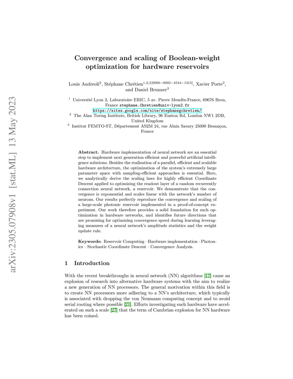 Hardware implementation of neural network are an essential step to implement next generation efficient and powerful artificial intelligence solutions. Besides the realization of a parallel, efficient and scalable hardware architecture, the optimization of the system's extremely large parameter space with sampling-efficient approaches is essential. Here, we analytically derive the scaling laws for highly efficient Coordinate Descent applied to optimizing the readout layer of a random recurrently connection neural network, a reservoir. We demonstrate that the convergence is exponential and scales linear with the network's number of neurons. Our results perfectly reproduce the convergence and scaling of a large-scale photonic reservoir implemented in a proof-of-concept experiment. Our work therefore provides a solid foundation for such optimization in hardware networks, and identifies future directions that are promising for optimizing convergence speed during learning leveraging measures of a neural network's amplitude statistics and the weight update rule.