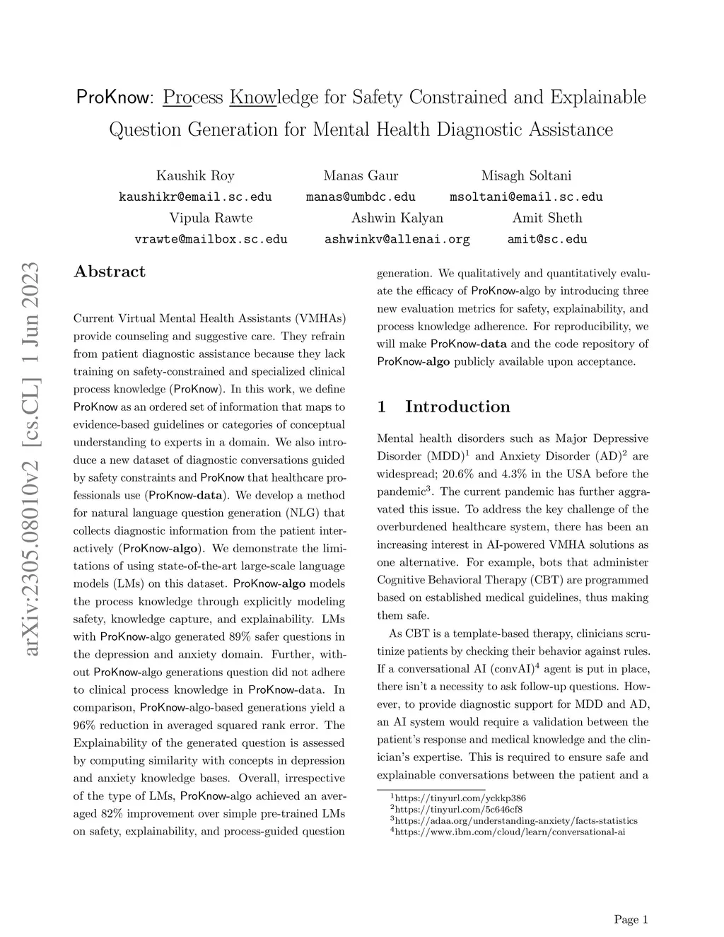 Current Virtual Mental Health Assistants (VMHAs) provide counseling and suggestive care. They refrain from patient diagnostic assistance because they lack training in safety-constrained and specialized clinical process knowledge. In this work, we define Proknow as an ordered set of information that maps to evidence-based guidelines or categories of conceptual understanding to experts in a domain. We also introduce a new dataset of diagnostic conversations guided by safety constraints and Proknow that healthcare professionals use. We develop a method for natural language question generation (NLG) that collects diagnostic information from the patient interactively. We demonstrate the limitations of using state-of-the-art large-scale language models (LMs) on this dataset. Our algorithm models the process knowledge through explicitly modeling safety, knowledge capture, and explainability. LMs augmented with ProKnow guided method generated 89% safer questions in the depression and anxiety domain. The Explainability of the generated question is assessed by computing similarity with concepts in depression and anxiety knowledge bases. Overall, irrespective of the type of LMs augmented with our ProKnow, we achieved an average 82% improvement over simple pre-trained LMs on safety, explainability, and process-guided question generation. We qualitatively and quantitatively evaluate the efficacy of the proposed ProKnow-guided methods by introducing three new evaluation metrics for safety, explainability, and process knowledge adherence.