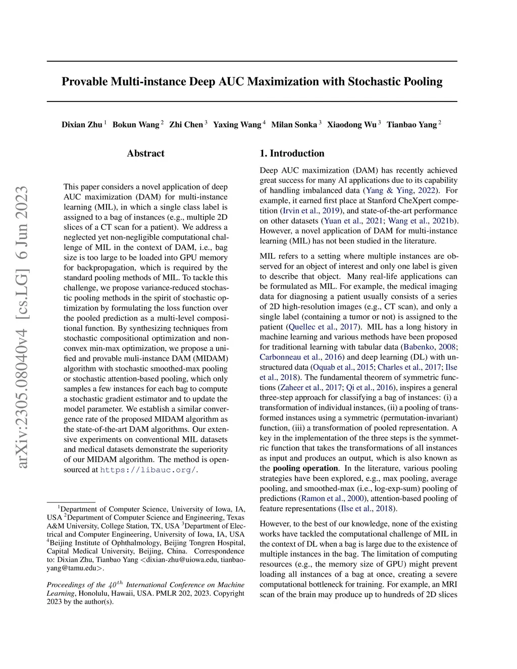 This paper considers a novel application of deep AUC maximization (DAM) for multi-instance learning (MIL), in which a single class label is assigned to a bag of instances (e.g., multiple 2D slices of a CT scan for a patient). We address a neglected yet non-negligible computational challenge of MIL in the context of DAM, i.e., bag size is too large to be loaded into {GPU} memory for backpropagation, which is required by the standard pooling methods of MIL. To tackle this challenge, we propose variance-reduced stochastic pooling methods in the spirit of stochastic optimization by formulating the loss function over the pooled prediction as a multi-level compositional function. By synthesizing techniques from stochastic compositional optimization and non-convex min-max optimization, we propose a unified and provable muli-instance DAM (MIDAM) algorithm with stochastic smoothed-max pooling or stochastic attention-based pooling, which only samples a few instances for each bag to compute a stochastic gradient estimator and to update the model parameter. We establish a similar convergence rate of the proposed MIDAM algorithm as the state-of-the-art DAM algorithms. Our extensive experiments on conventional MIL datasets and medical datasets demonstrate the superiority of our MIDAM algorithm.